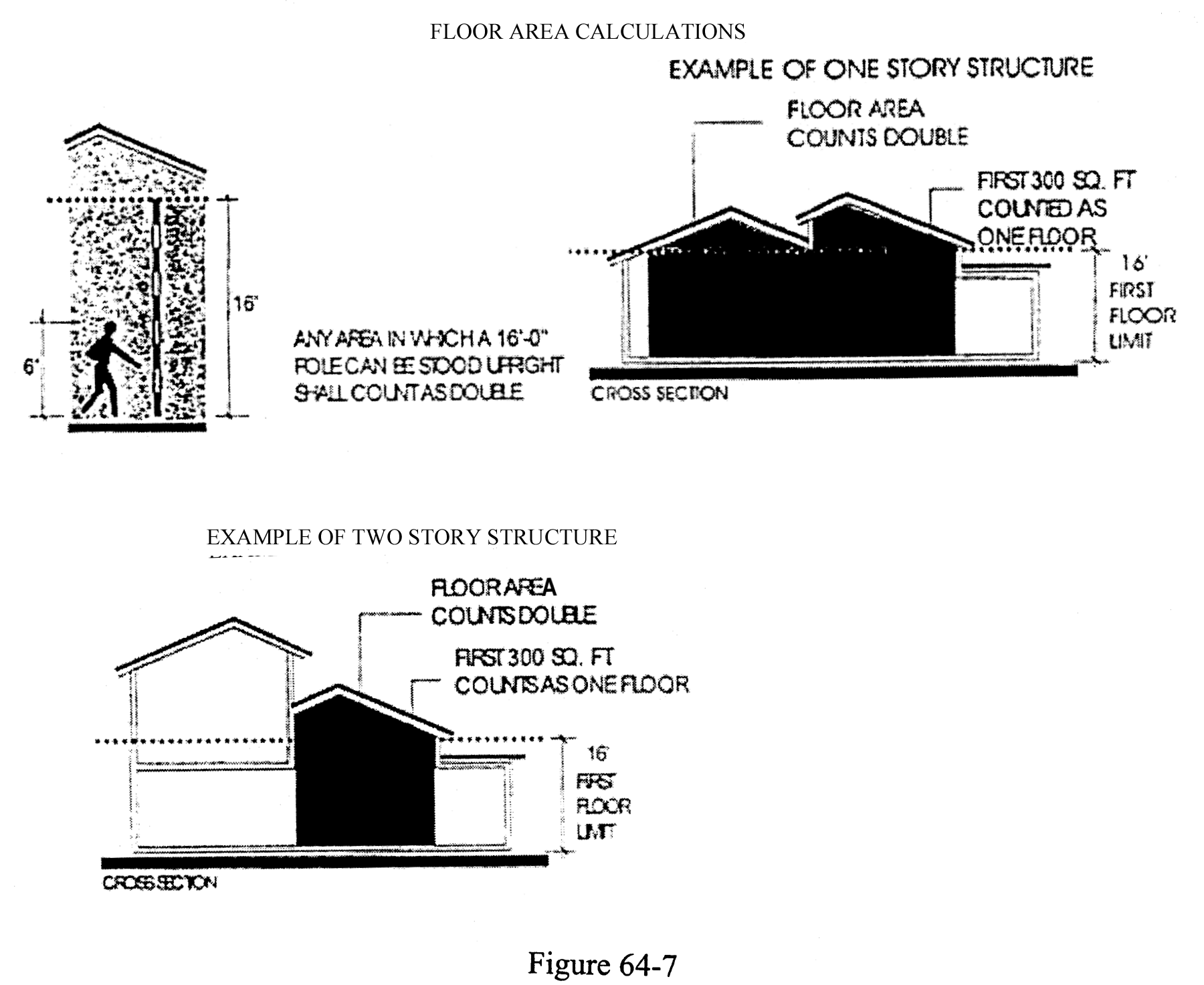 When calculating total floor area, the first floor area under ceilings which are 16 feet or higher shall count as double. The first 300 square feet thereof, however, shall be counted as one floor to allow for limited vaulted spaces. The second floor area shall not exceed 75 percent of the first floor.