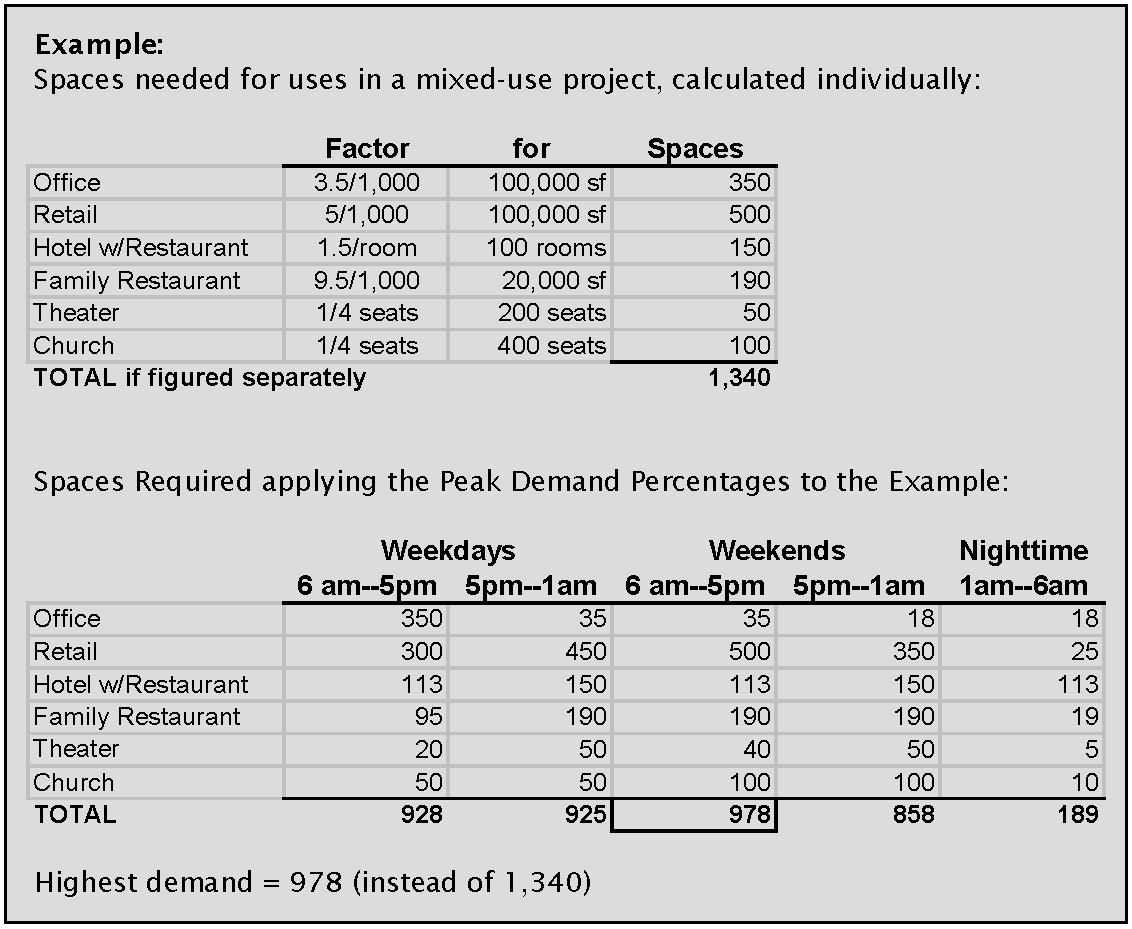 By way of example, the following illustrates shared parking calculations for a particular mixed-use development: