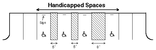 Handicap accessible parking spaces shall have an adjacent aisle five feet wide, and one in every six handicapped spaces shall be adjacent to an aisle eight feet wide and the space shall be signed "van accessible." Handicapped parking space aisles shall be clearly demarcated by lines painted on or otherwise applied to the parking lot surface.