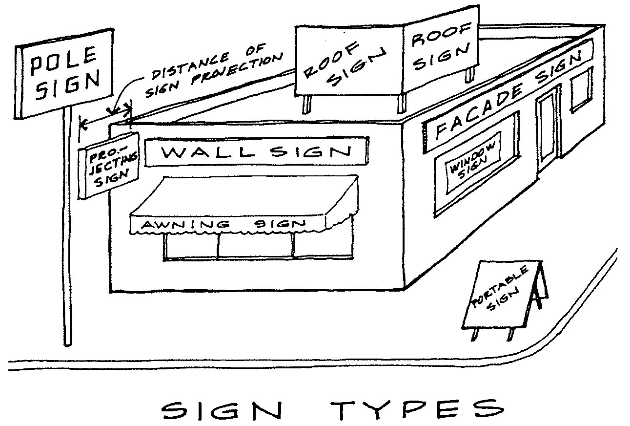 Building Sign: A sign that in any manner is fastened to, projects from, or is placed or painted upon the exterior wall, window, door, or roof of a building. The term "building sign" includes but is not limited to the following: