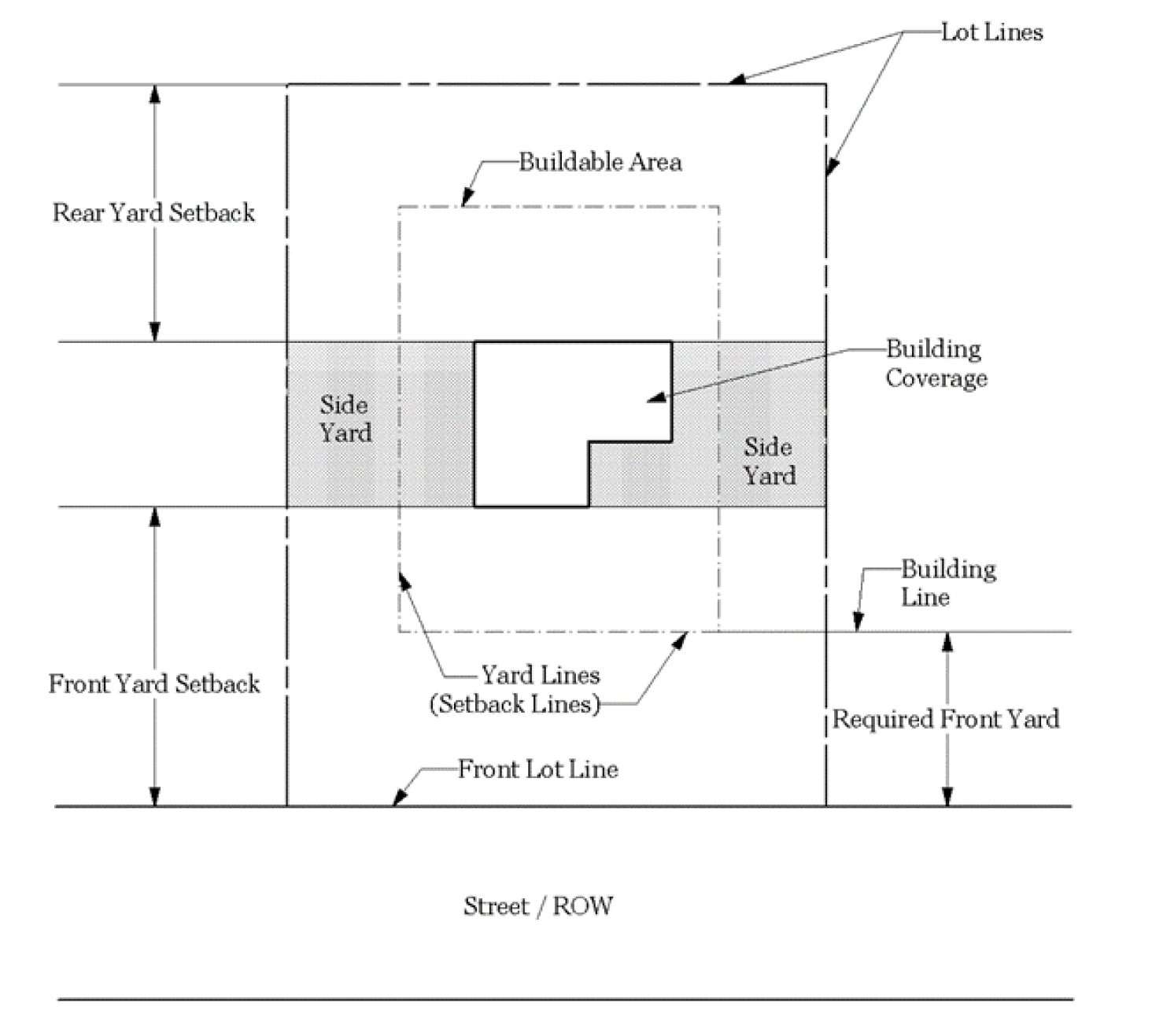 The required front, side, and rear yards for individual lots shall be measured inward toward the center of said lot from all points along the respective front, side, and rear property lines of the lot, or from the road right-of-way if applicable. Once the yard areas of a given lot have been established, the remaining area of the lot which is not included in any required front, side, or rear lot shall be known as the "buildable" area within which the approved structure(s) shall be placed.