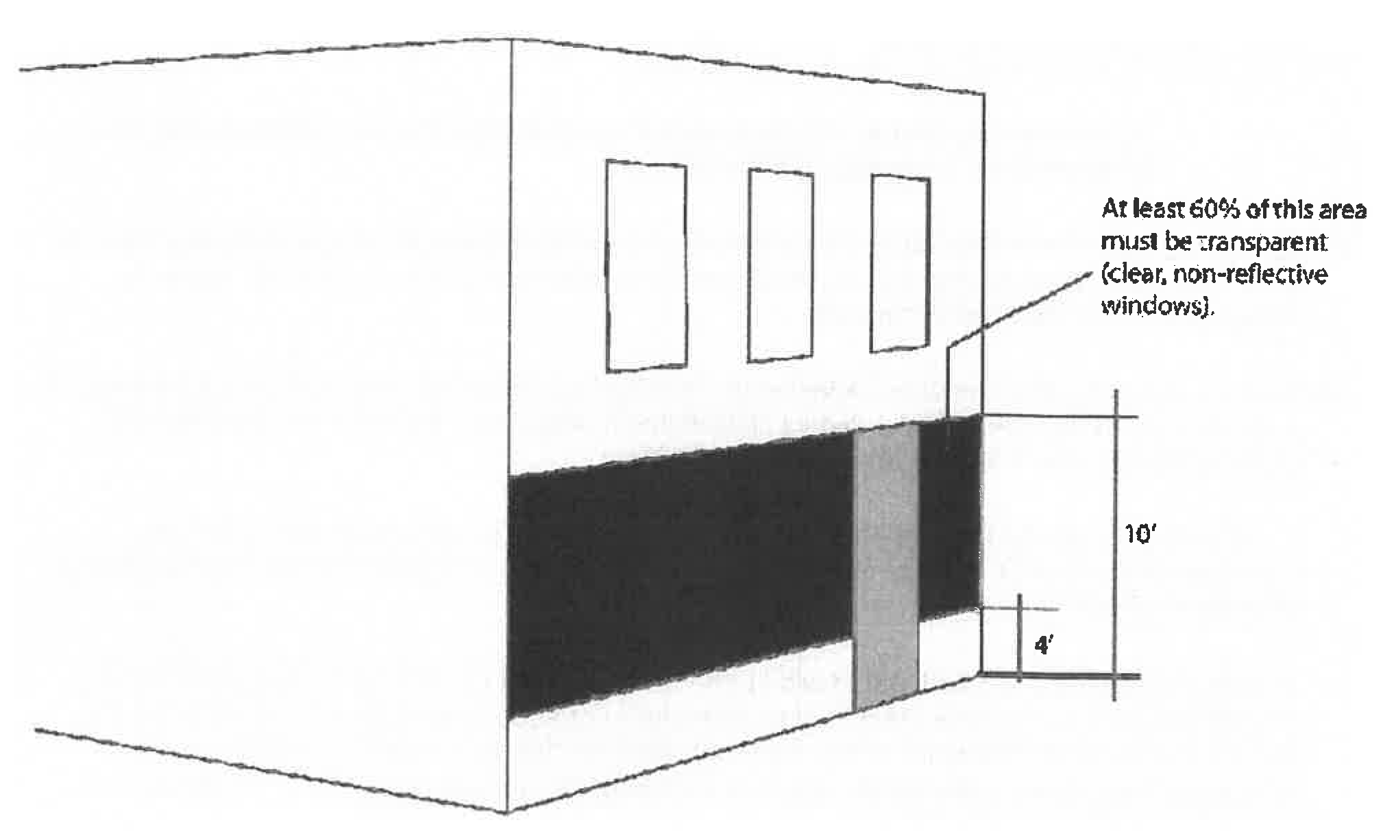 Building Transparency: A minimum of sixty percent of the street facing facade between four feet and ten feet in height must consist of clear, nonreflective windows that allow views into the interior of the building.
