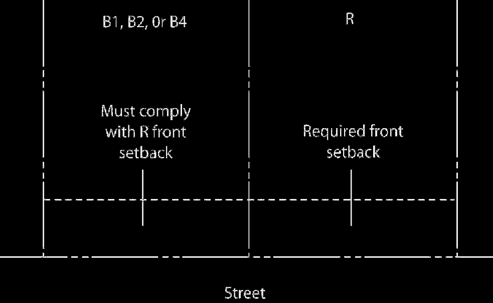 Front Setback: Where a B1, B2 or B4 zoned lot shares a side property line with an R zoned lot, the B1, B2 or B4 zoned lot must comply with the front setback standards of the R zoned lot.