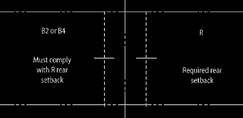 Rear Setback: Where a B2 or B4 zoned lot shares a rear property line with an R zoned lot, the B2 or B4 zoned lot must comply with the rear setback standards of the R zoned lot.