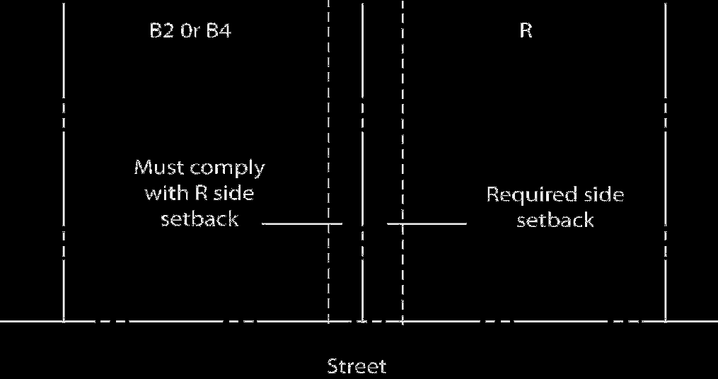 Interior Side Setback: Where a B2 or B4 zoned lot shares a side property line with an R zoned lot, the B2 or B4 zoned lot must comply with the side setback standards of the R zoned lot.