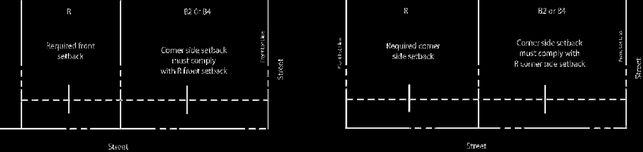 Corner Side Setback: Where a B2 or B4 zoned lot abuts a residentially zoned lot, the corner side setback of the lot zoned B2 or B4 must comply with the front or corner side setback of the abutting residential district.