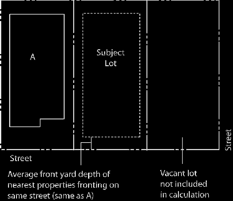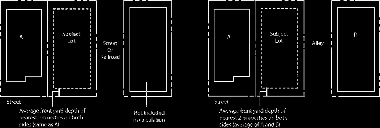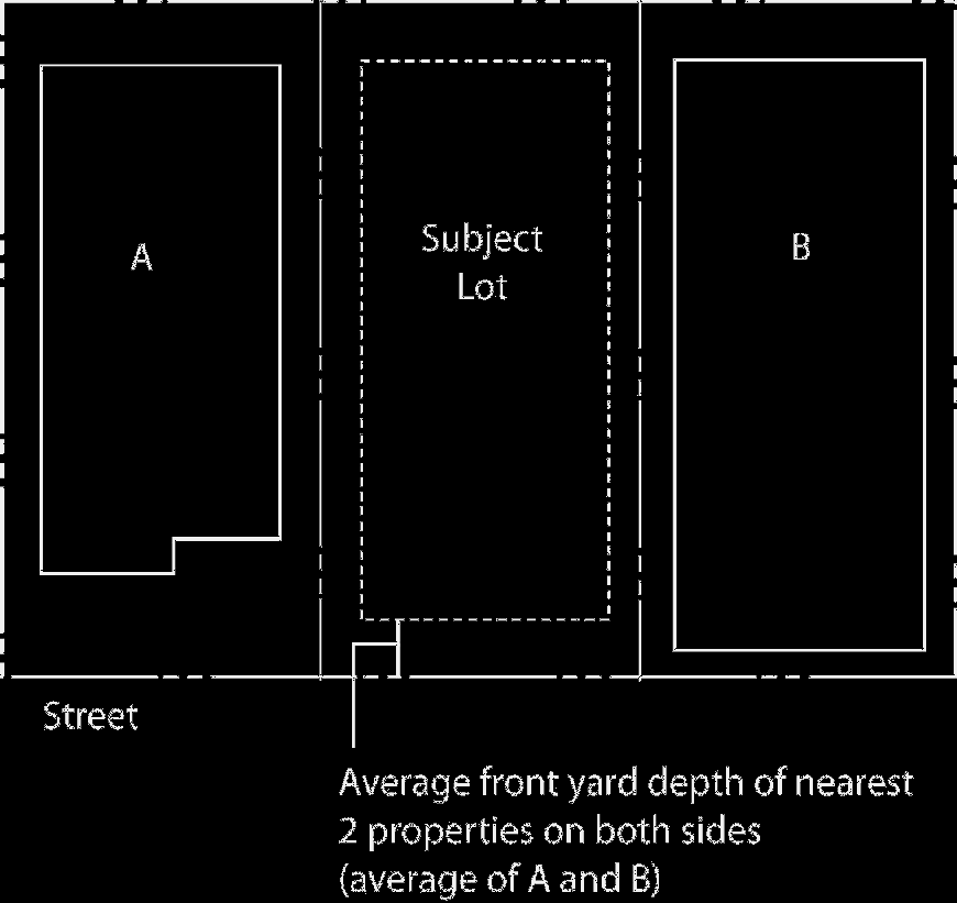 When utilizing the average front setback, it must be at least as deep as the average of the front setbacks on the two lots on either side of the subject lot, in accordance with the following rules: