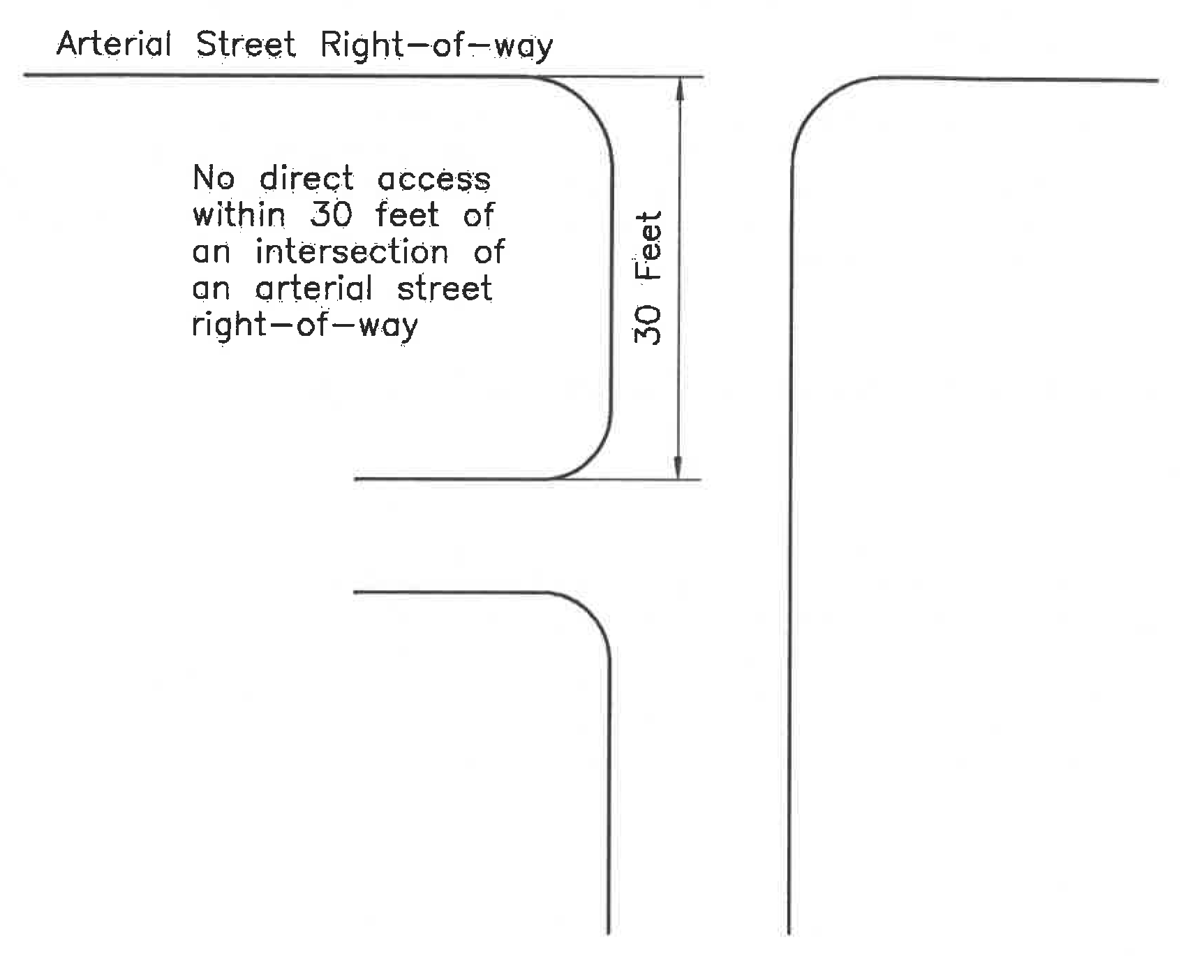 Direct access may not be taken within thirty feet of an intersection of an arterial street right-of-way in an urban area and direct access may not be taken within fifty feet of an intersection in a rural area.