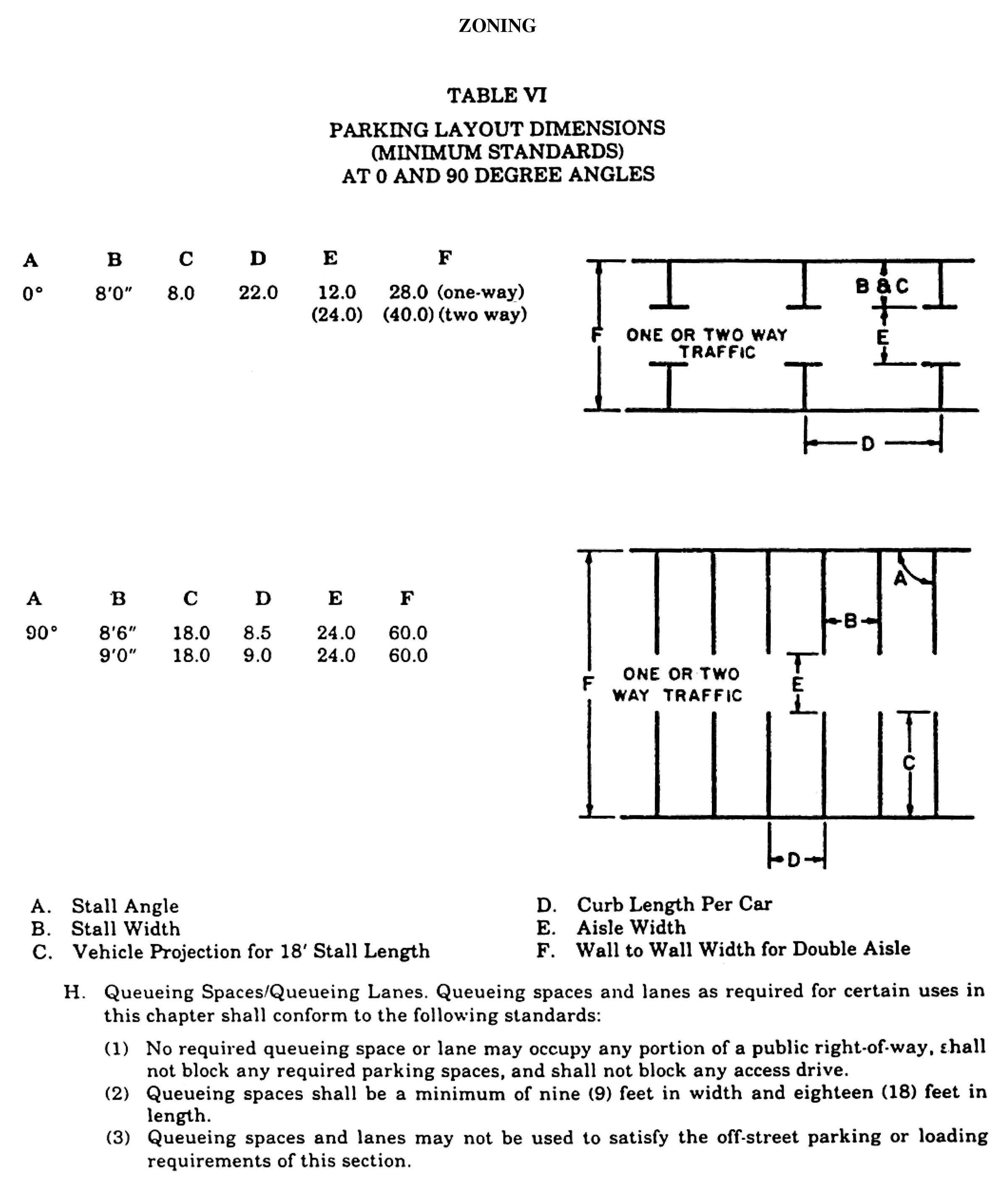 Basic Design Standards. The basic parking stall shall be eight and one-half feet in width and 18 feet in length. The following tables and diagrams establish minimum design standards for parking areas utilizing this minimum requirement, as well as dimensions to be followed if the optional parking stall size of nine feet in width and 18 feet in length is used. Nothing in these standards shall prohibit an owner/applicant from providing larger aisle widths or stall dimensions in excess of these minimum standards in order to better suit his/her development requirements.