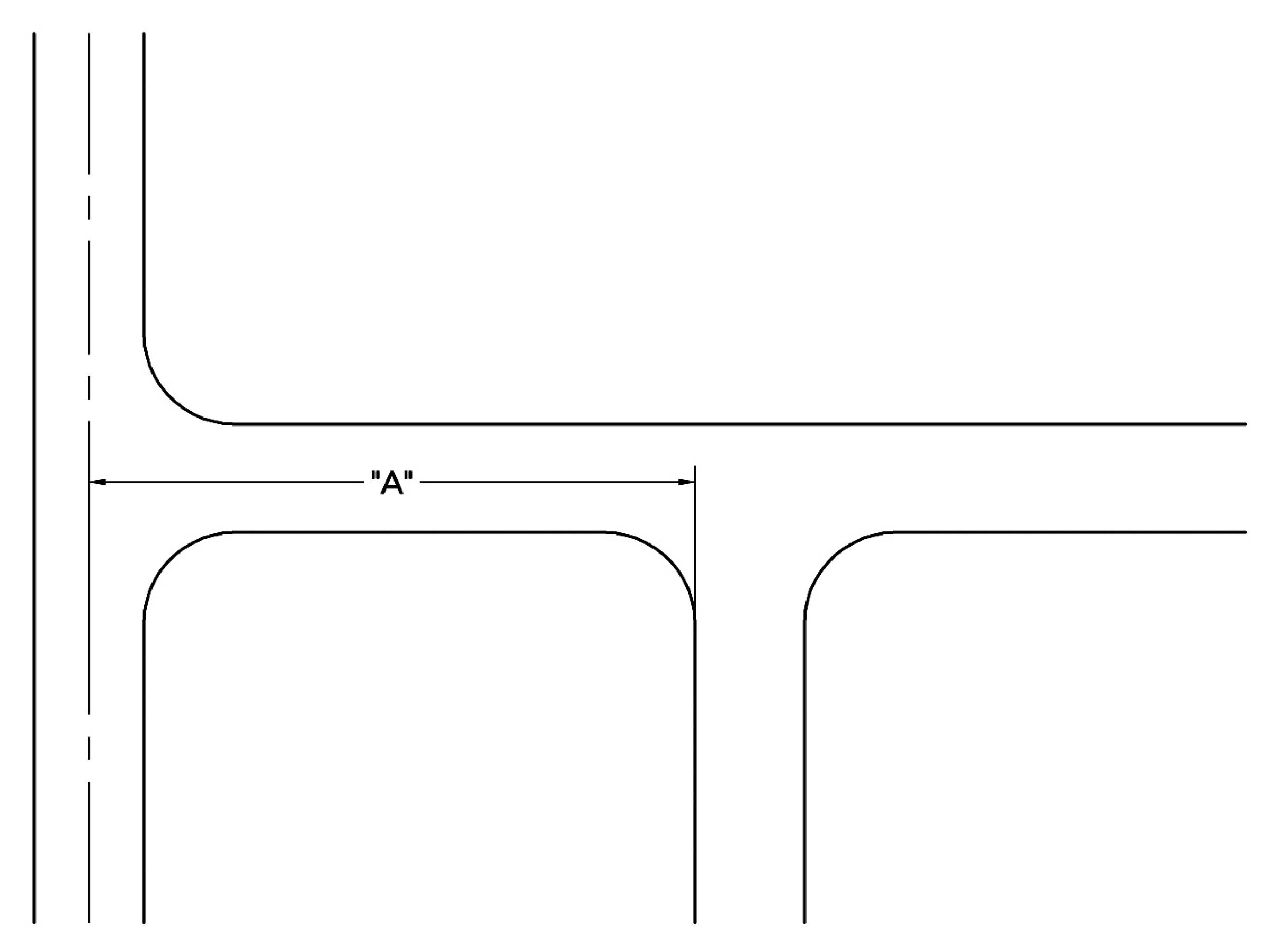 10800.8. Corner Clearance for Driveways. Driveways shall be separated from street intersections by the distance defined in the Table 10800.1. These distances, shown as "A" in Figure 10800.1 shall be measured from the centerline of streets and the curb line of driveways, excluding radii: