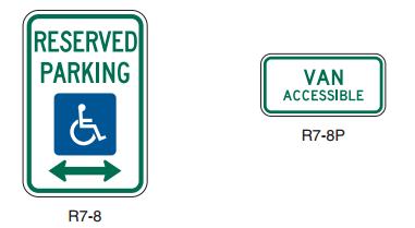 Each accessible space shall display sign R7-8, as provided in the latest edition of the Manual on Uniform Traffic Control Devices published by the Federal Highway Administration of the United States Department of Transportation, which includes the words "RESERVED PARKING" and the blue and white international symbol of access. Van-accessible physically disabled reserved parking spaces shall also display sign R7-8P immediately below sign R7-8. Signs shall be placed a minimum of five and a maximum of eight feet above ground level to the bottom of the sign so as not to be obscured by parked vehicles. Provided however, the blue and white international symbol of access, accompanied by the appropriate language including, but not limited to "Handicapped Parking", "Reserved for Handicapped" and "Permit Required-Towing Enforced" may be used in lieu of sign R7-8 if the sign was erected prior to January 1, 2010.