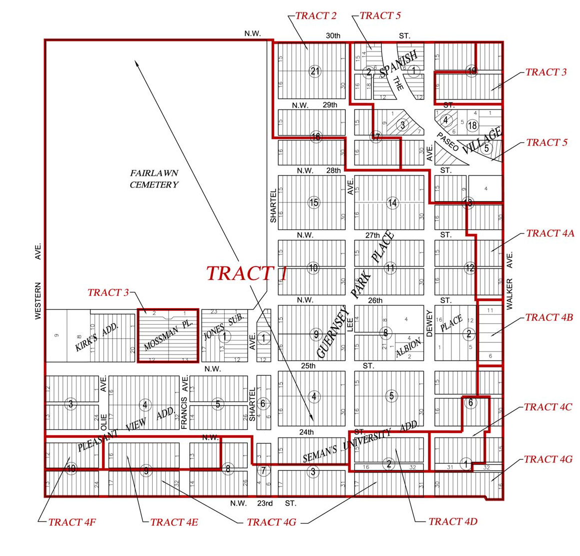 Included within the aforementioned boundaries are the following subdivisions and unplatted land: The southern 25 feet of Lots 4, 5, and 12 through 17 of Block 13, Lots 1 through 18 of Block 14, Lots 1 through 18 of Block 15, Lots 1 through 12 of Block 16 of Winans Highland Terrace Addition; Winans Park; Lots 4 through 6 and Lots 13 through 19 of Block 16, Lots 1 through 2A and 6 through 11A of Block 1 of Nichols and Chandlers Addition; Lots 3 through 5 and 12 through 17 of Block 1, Lots 1 through 17 of Block 2, Lots 1 through 17 of Block 3 of Winans Highland Terrace Addition, all of Overholser and Aveys Addition including an unplatted parcel starting at the northwest corner of Lot 5 in Weavers Addition, south 400 feet, west 430.3 feet, north 50 feet, east 300.3 feet, north 350 feet, and east 130 feet back to the point of origin; all of Weavers Addition; and all of Fays Addition.
