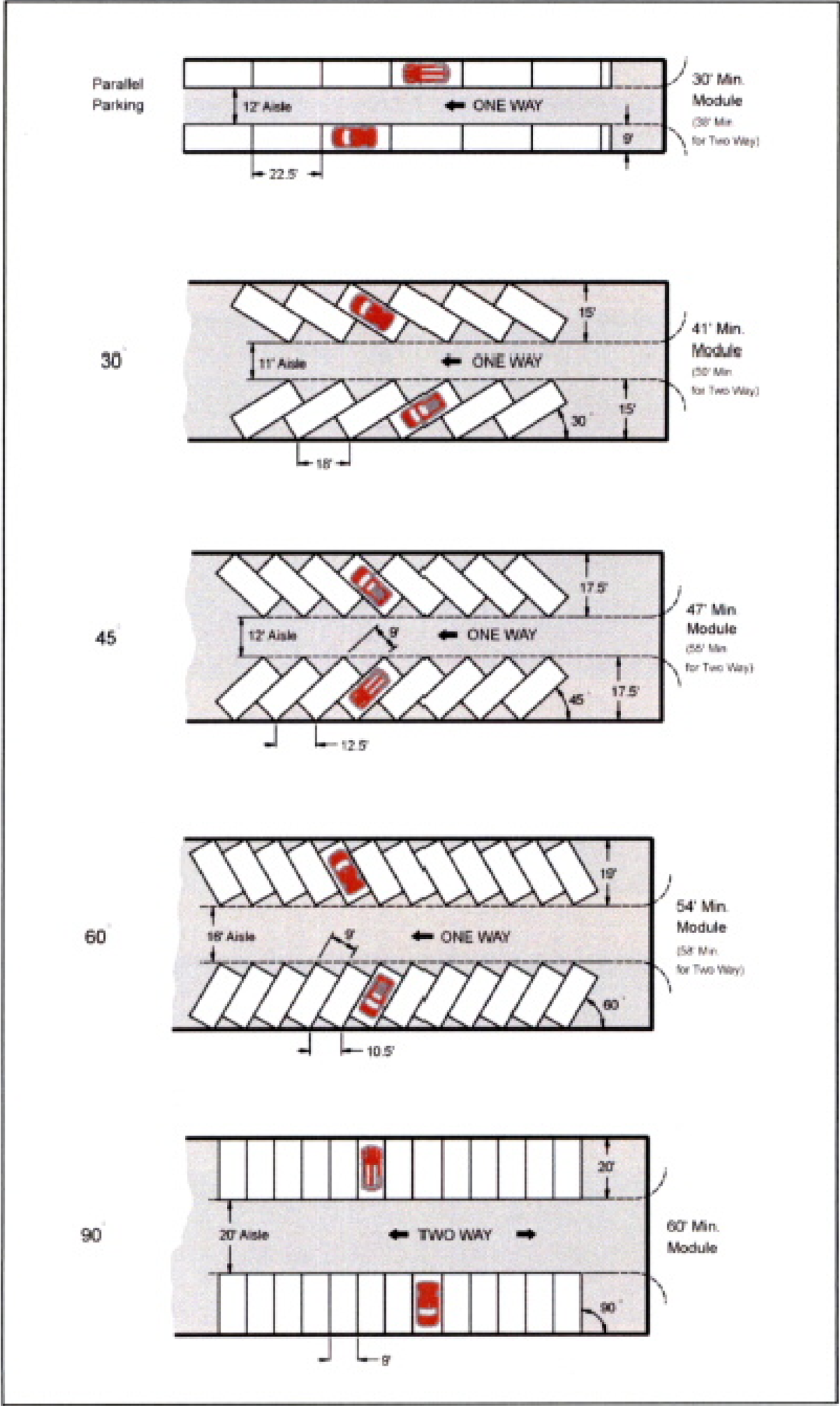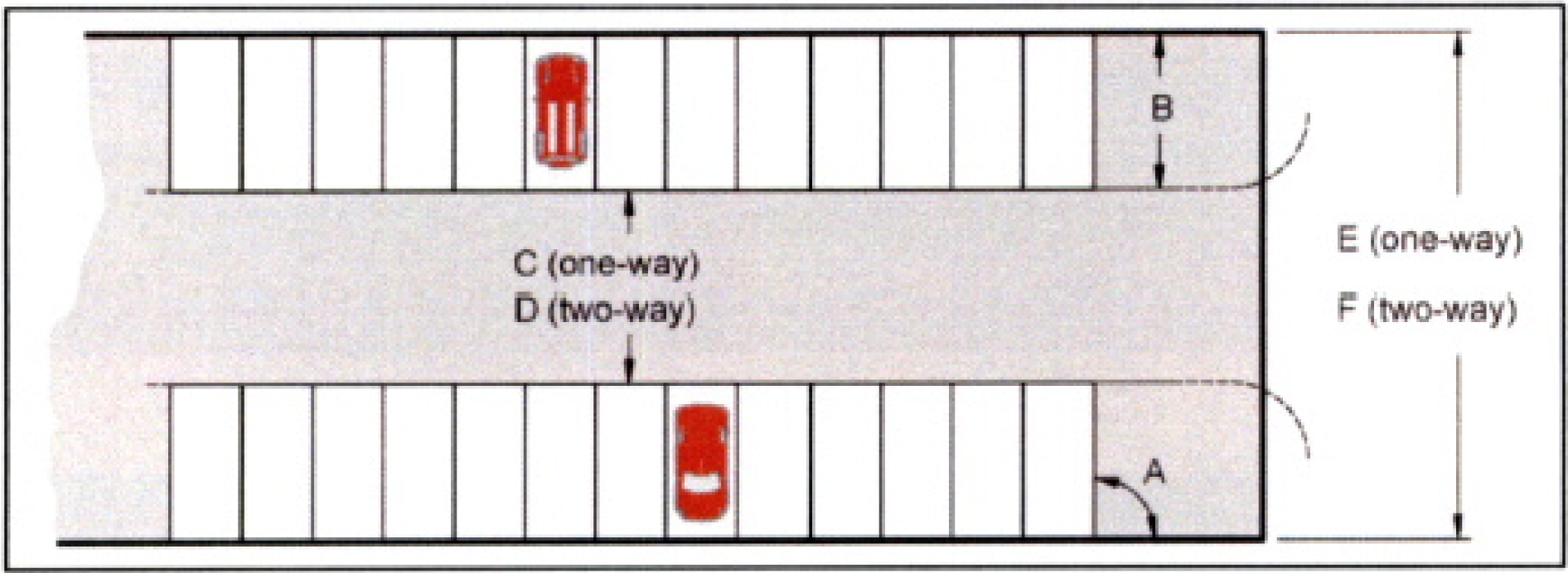 Table 40-138.1 (off street vehicle parking space dimensions) sets forth minimum size requirements for individual parking spaces. Design standards for handicapped parking stalls shall be provided in compliance with current requirements of the state and the building codes as currently adopted and amended by the City of Olmos Park.