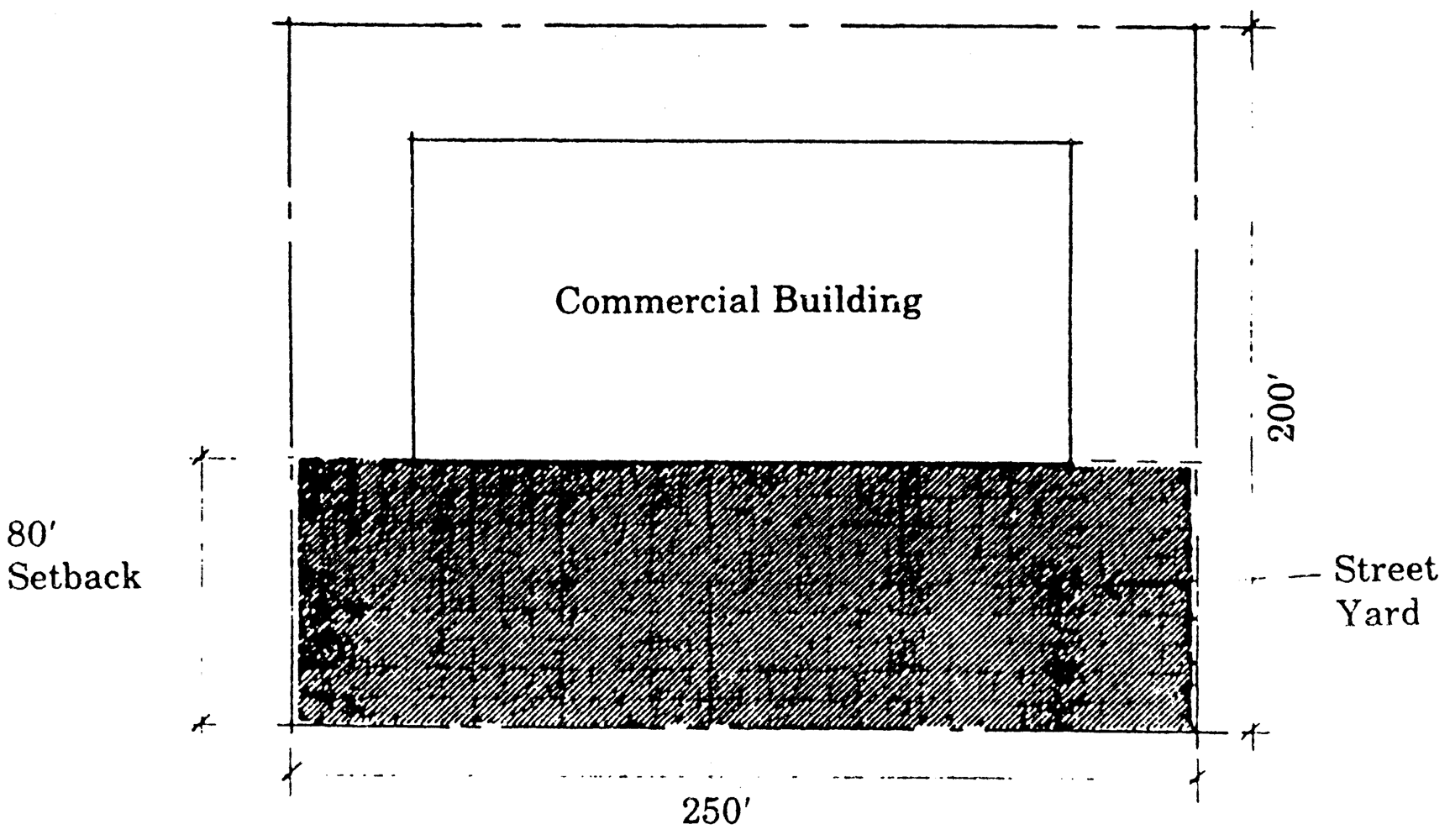 The size of the street yard is 80 feet by 250 feet, or 20,000 square feet. In the CC district, 20 percent of this area must be landscaped. Thus 4,000 square feet of the street yard must be landscaped.