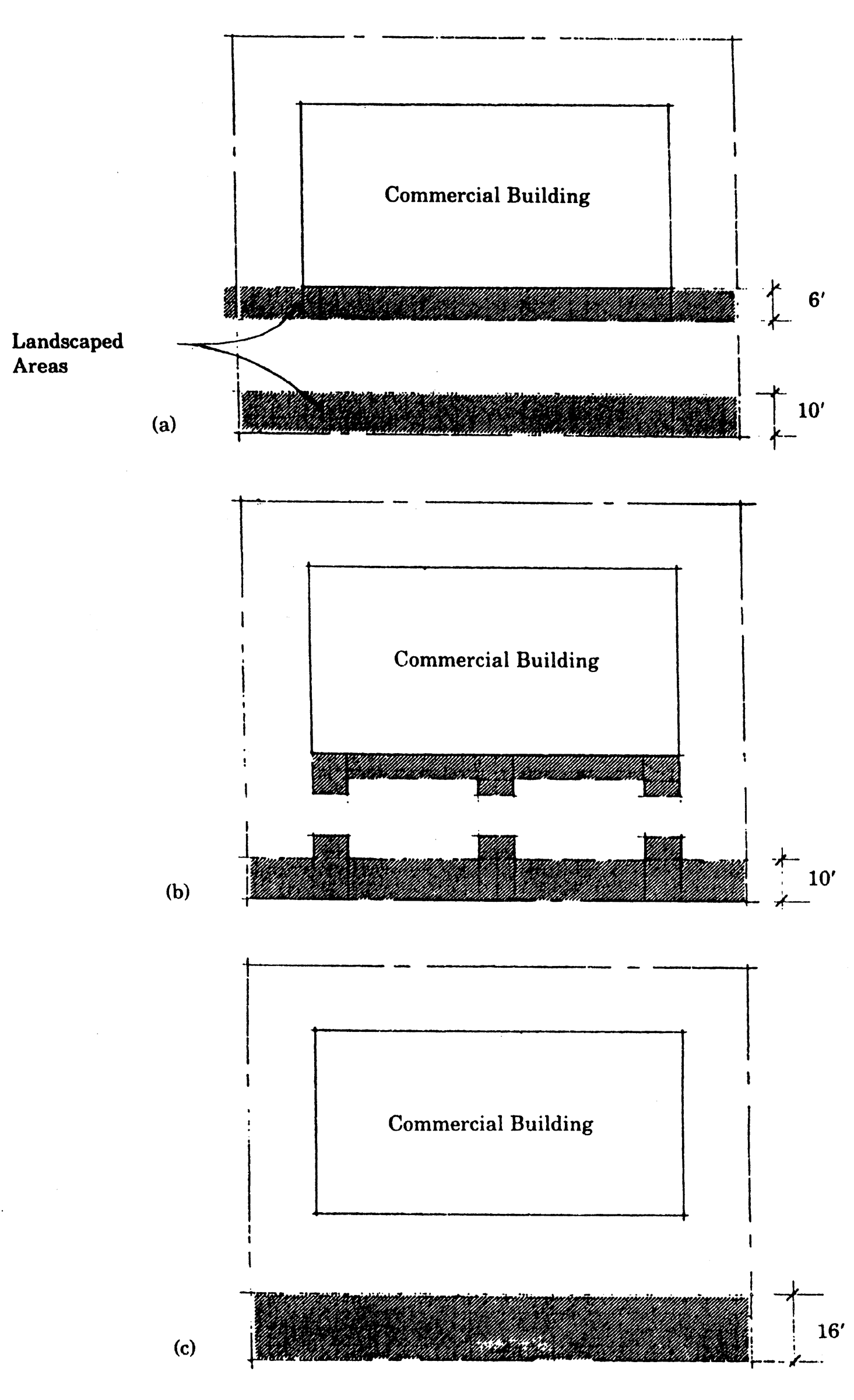 Therefore, an additional 1,500 square feet of landscaping is required. Diagrams (a), (b), and (c) give examples of how the street landscaping requirements could be satisfied.
