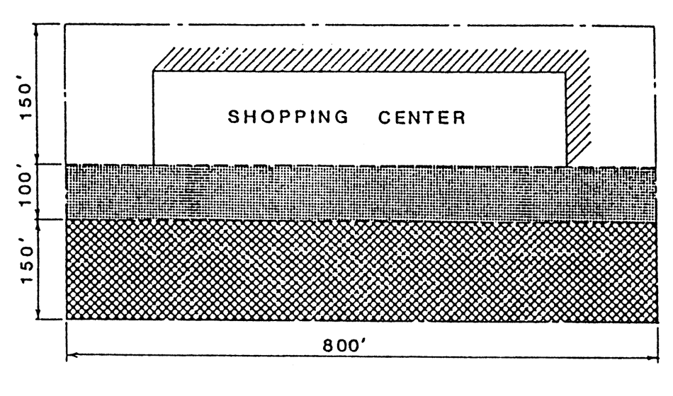 A minimum of 20 percent of the first 150 feet of the street yard, or 24,000 square feet must be landscaped. However, some of the required landscaping within the second 100 feet may be transferred to the front of the lot, provided that not less than five percent of this second area is landscaped. Thus, the developer could choose to transfer up to 4,000 square feet of landscaping from the second part of the street yard to the front 150 feet.