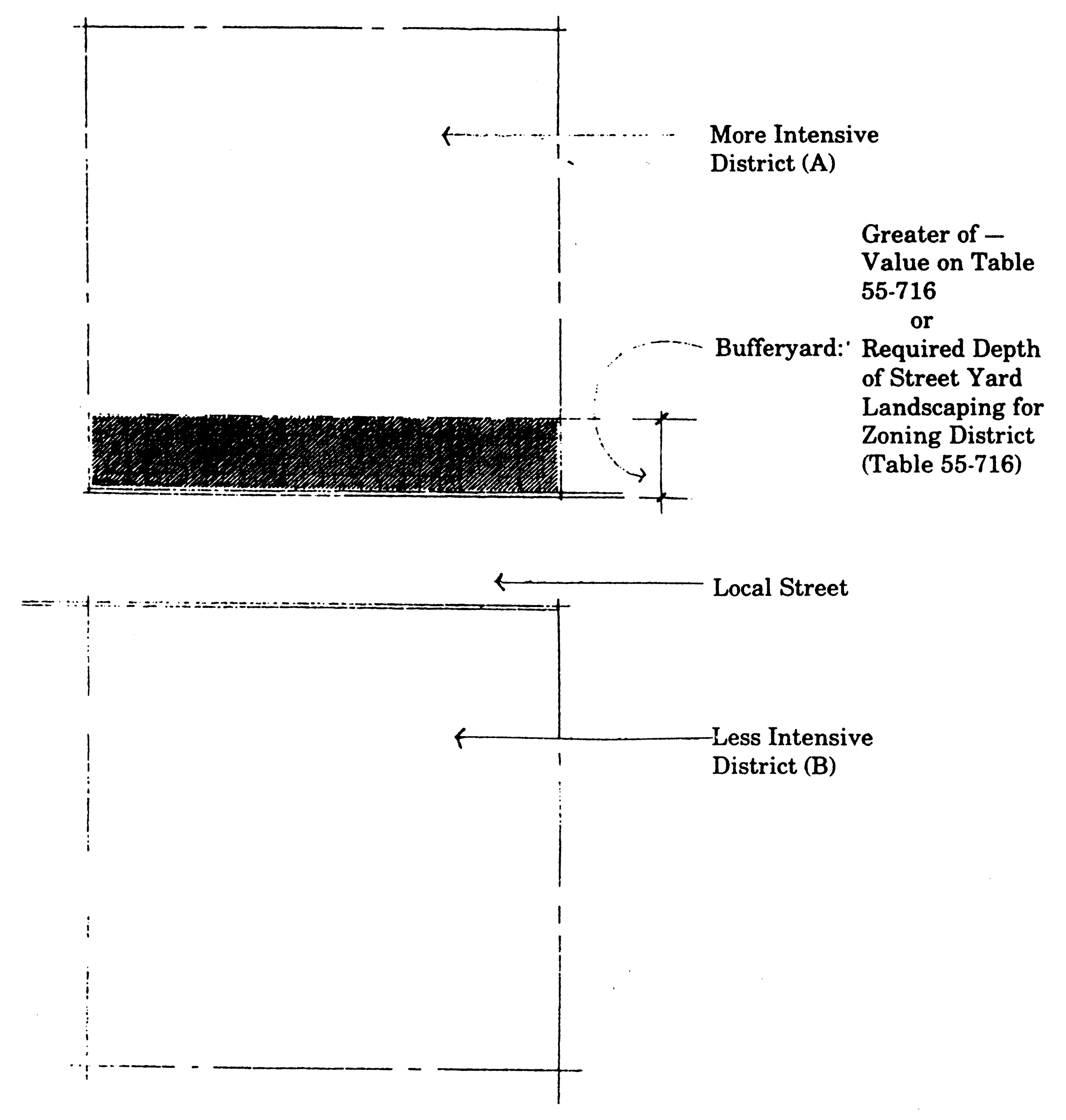 Districts with intervening local street. When a local street separates adjacent districts requiring a bufferyard, the required bufferyard shall be the greater of the required bufferyard set forth in table 55-716 or the minimum depth of front yard landscaping provided by table 55-715. (See exhibit 55-716(d).)