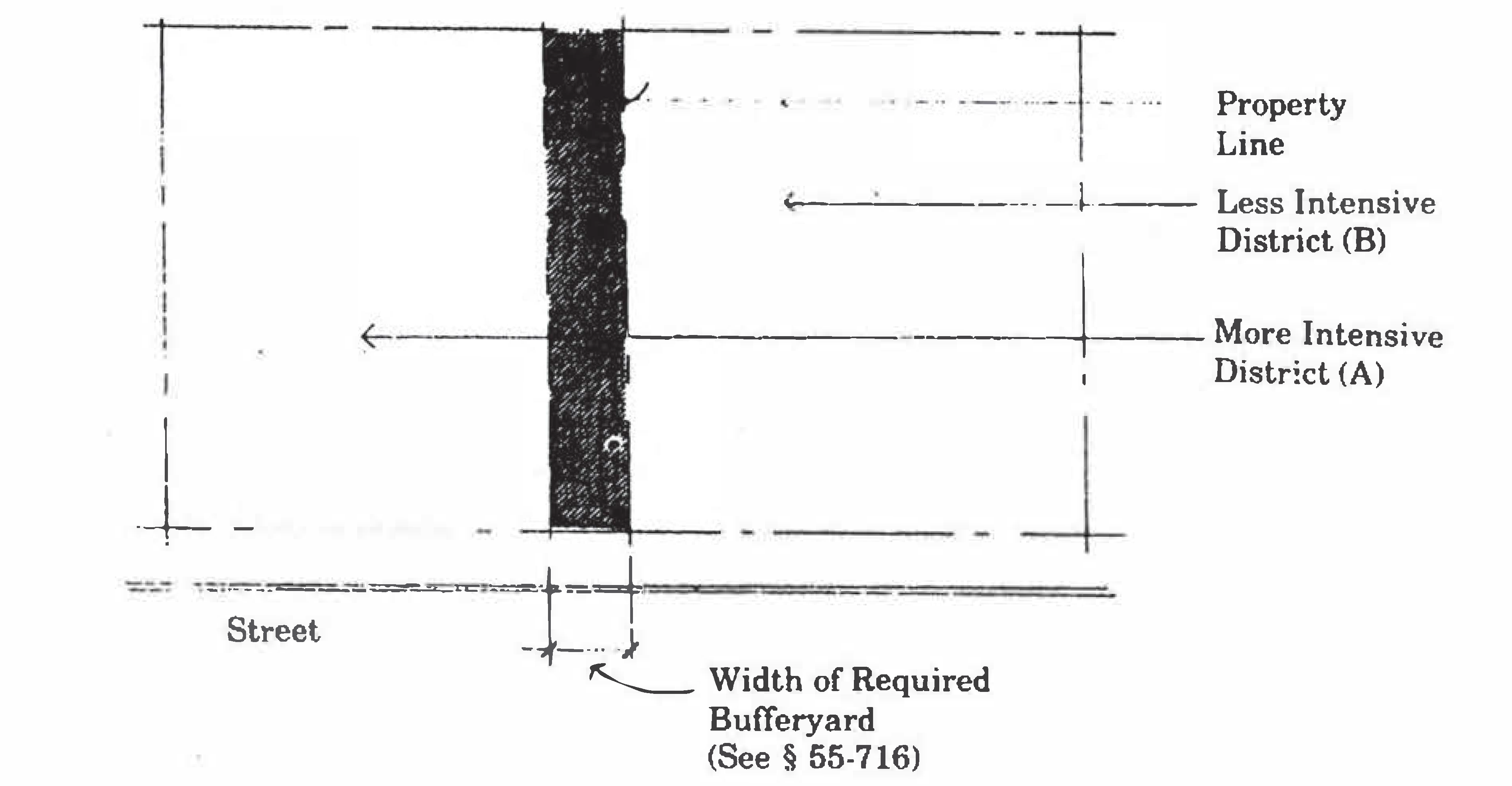 Districts with common lot lines. When the use in the more intensive zoning district has a common lot line with a less intensive zoning district, the required bufferyard is set forth in table 55-716. (See exhibit 55-716(a).)