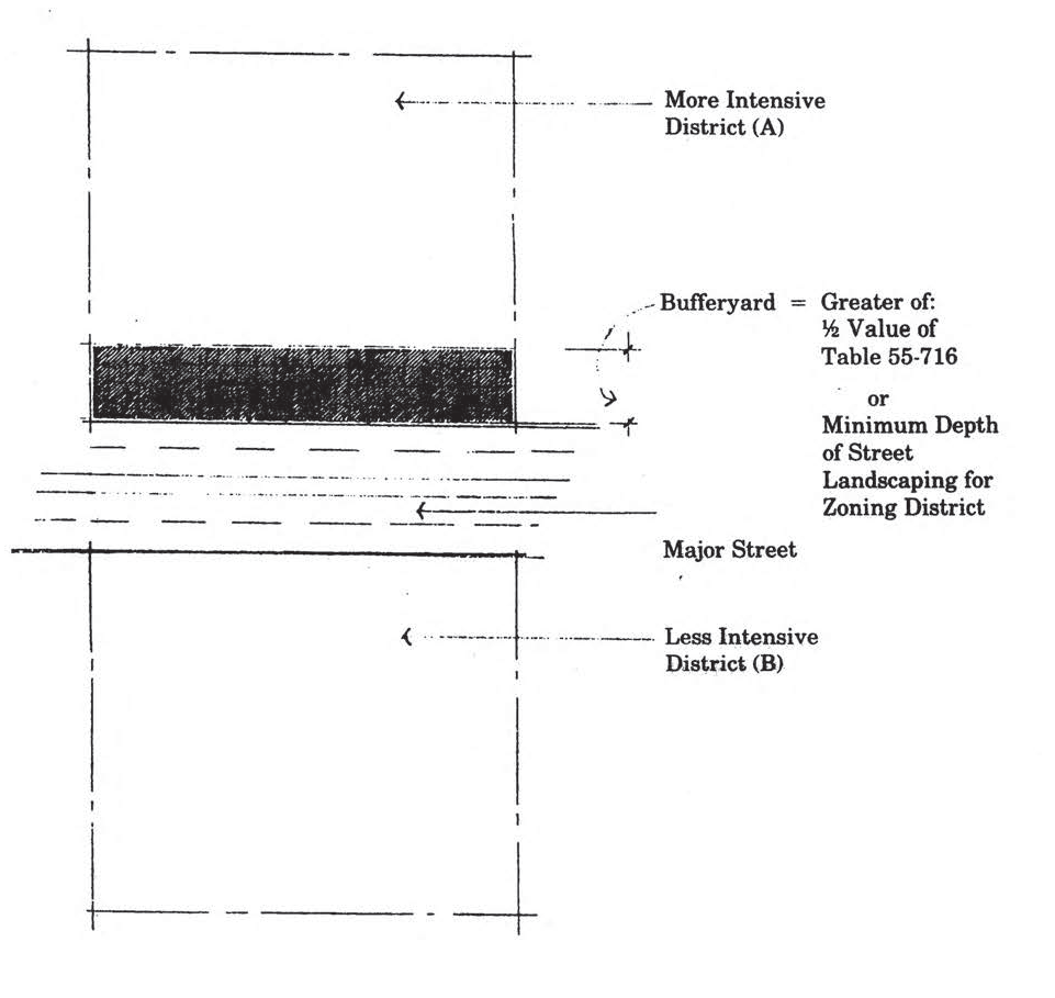 Districts with intervening major street. When a collector or arterial street separates adjacent districts requiring a bufferyard, the required bufferyard shall be the greater of one-half the required bufferyard set forth by table 55-716 or the minimum depth of front yard landscaping provided by table 55-715. (See exhibit 55-716(c).)