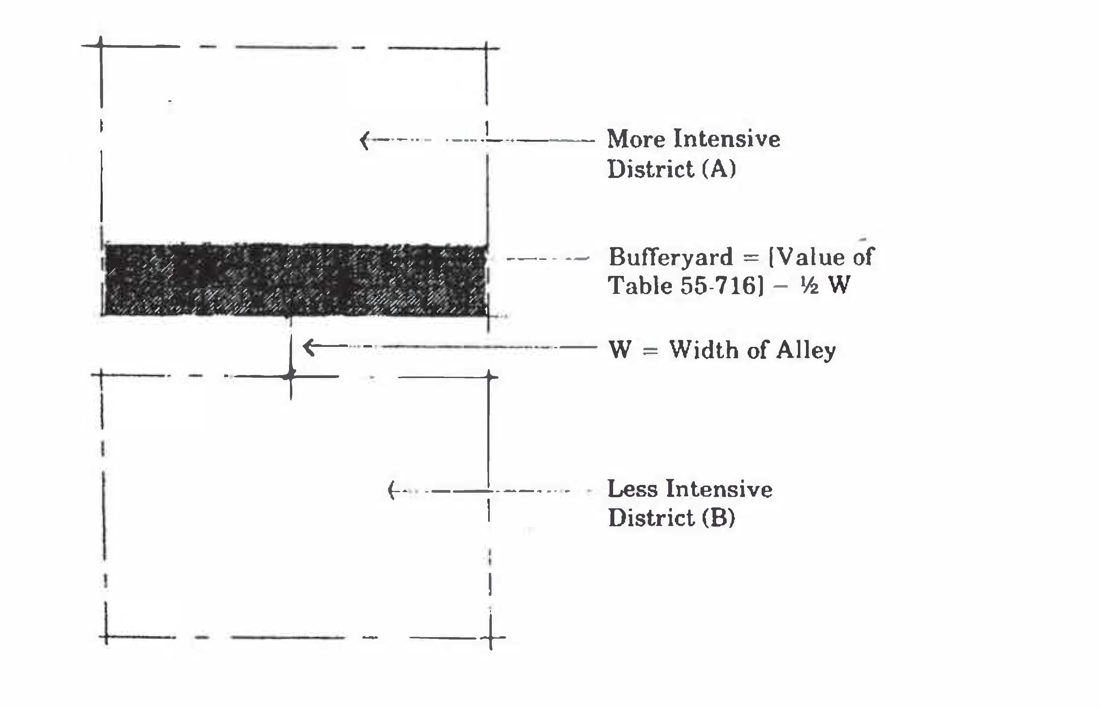 Districts with intervening alleys. When an alley separates adjacent districts requiring a bufferyard, one-half the width of the alley shall be credited toward meeting the required bufferyard. (See exhibit 55-716(b).)