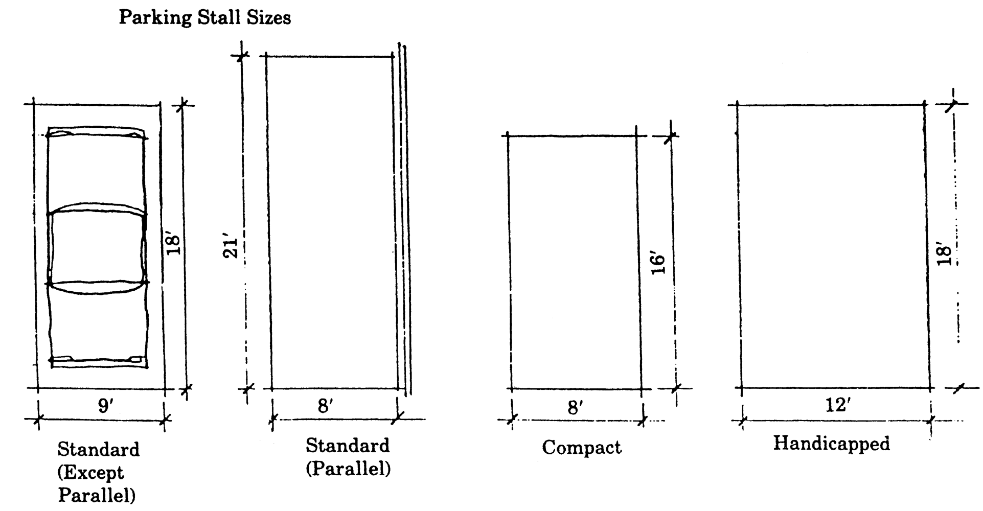 Standard parking stalls must comply with minimum dimensions specified in Table 55-740(1) and Figure 55-740 (following this section). The standard size parking stall shall be at least nine feet wide and 18 feet long.