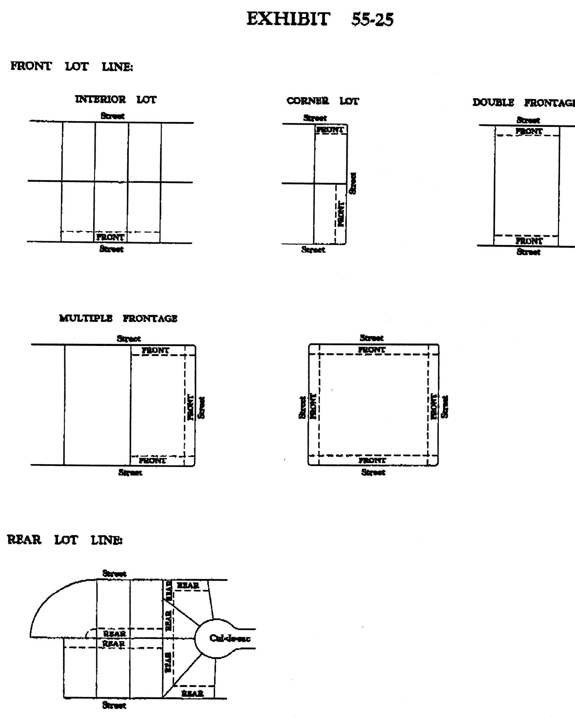 Rear lot line: The interior lot line(s) including a point at the intersection of two side lot lines which is opposite and most distant from any adjacent street. (See Exhibit 55-25 at the end of this article).