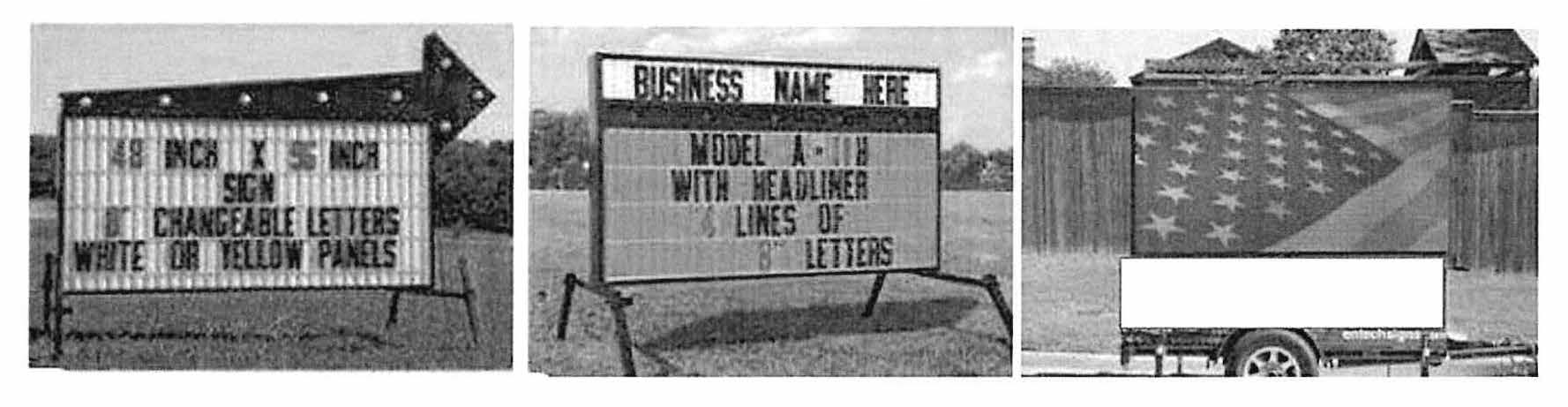 Portable Sign. Means a sign that is designed to be easily transportable, including, but not limited to, signs designed to be displayed while mounted or affixed to the trailer by which it is transported, or with wheels remaining otherwise attached during display; signs mounted on transportable frames with wheels removed; signs attached or affixed to a chassis or other moveable support constructed without wheels, signs designed as, or converted to, A-frame or T-Frame signs.