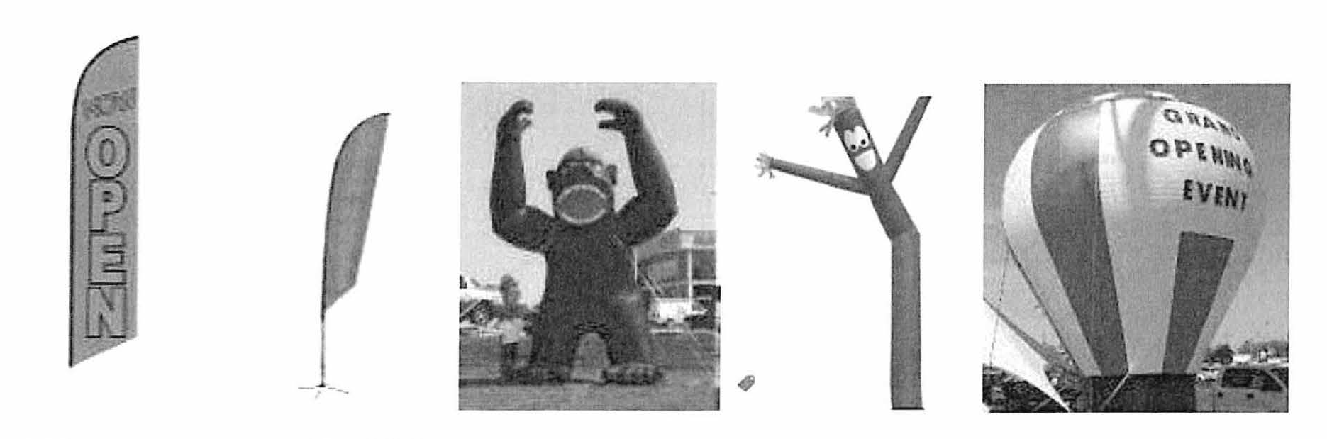 Promotional Sign. Means a sign used for a temporary period to advertise a business or promote an activity and is not permanently affixed to a structure or the ground. Promotional signs include, but are not limited to: blade signs, feather flags, inflatables, air dancers, and inflatable tubes.