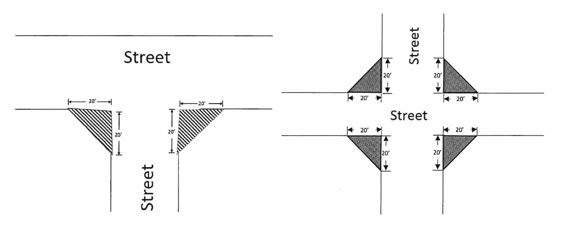 Sight Triangle. Means the area bounded by the street lines at corner lots and a straight line joining said street lines at points, measured along said street lines, that are twenty (20) feet distance from the point of intersection.
