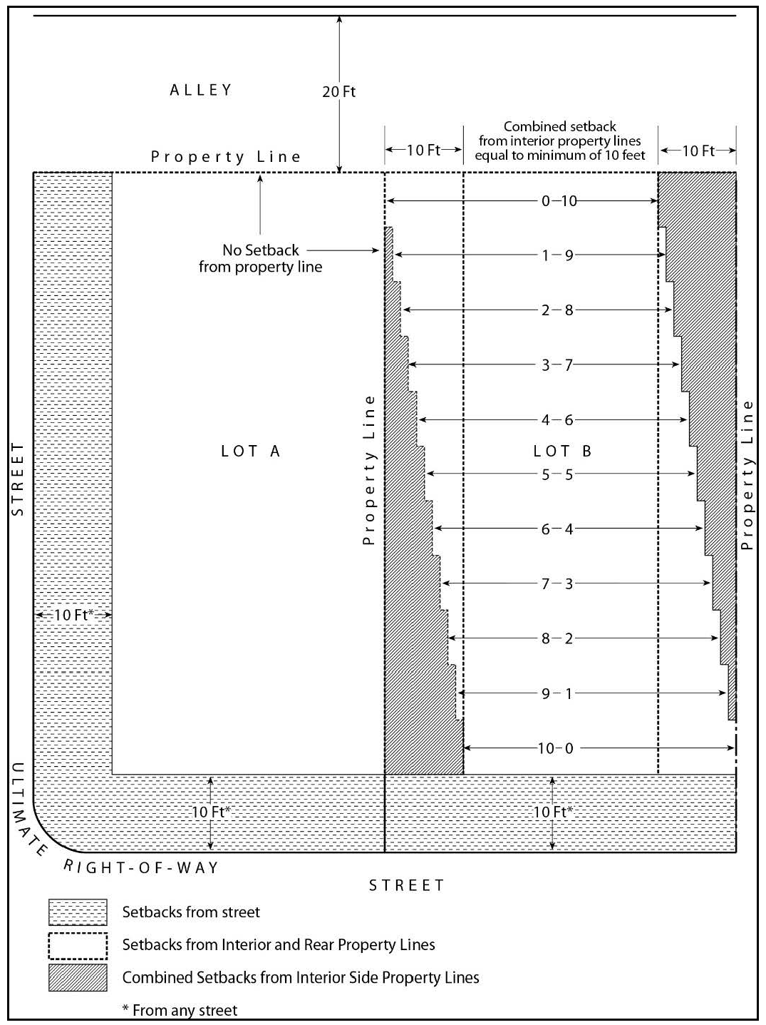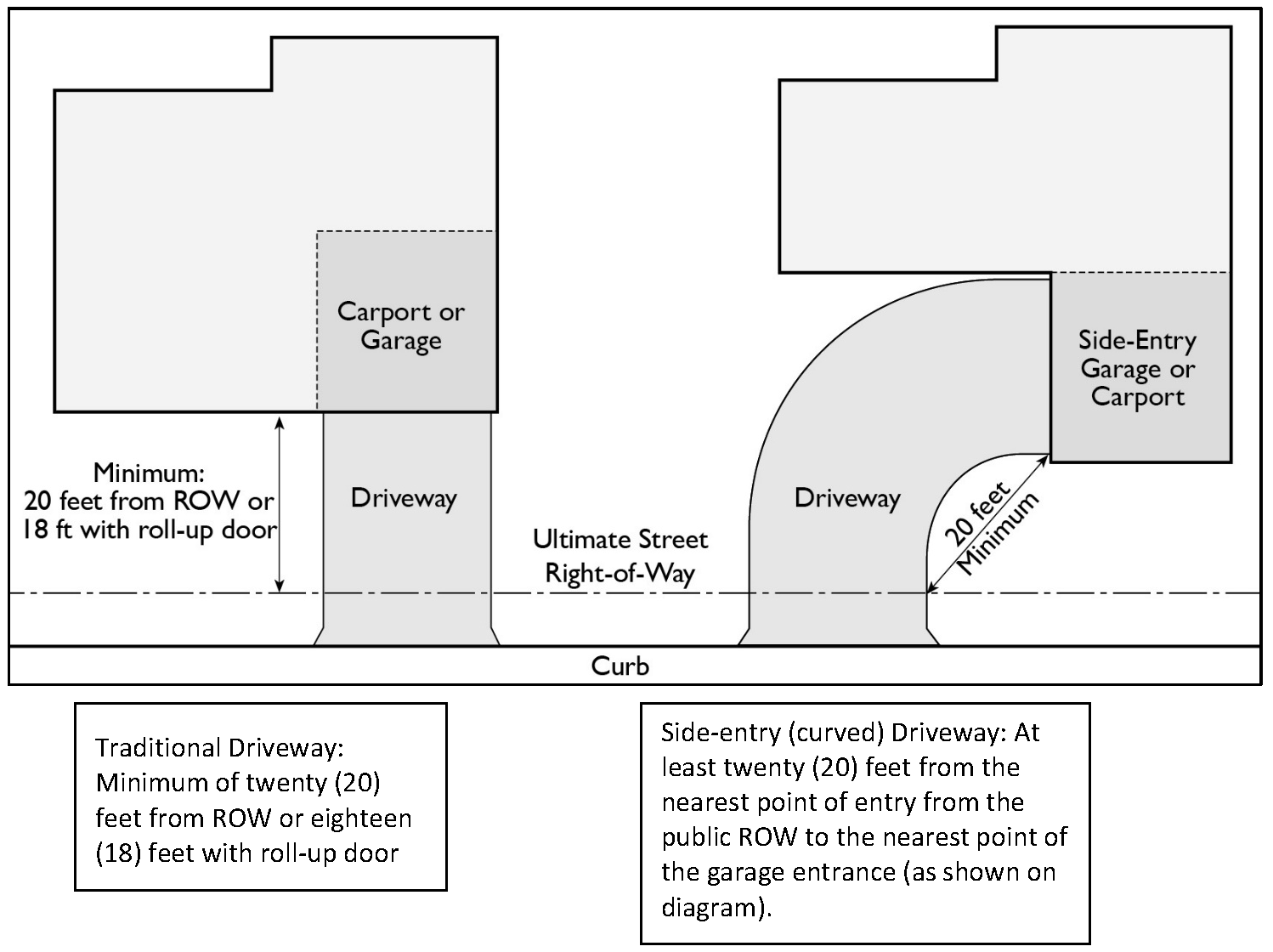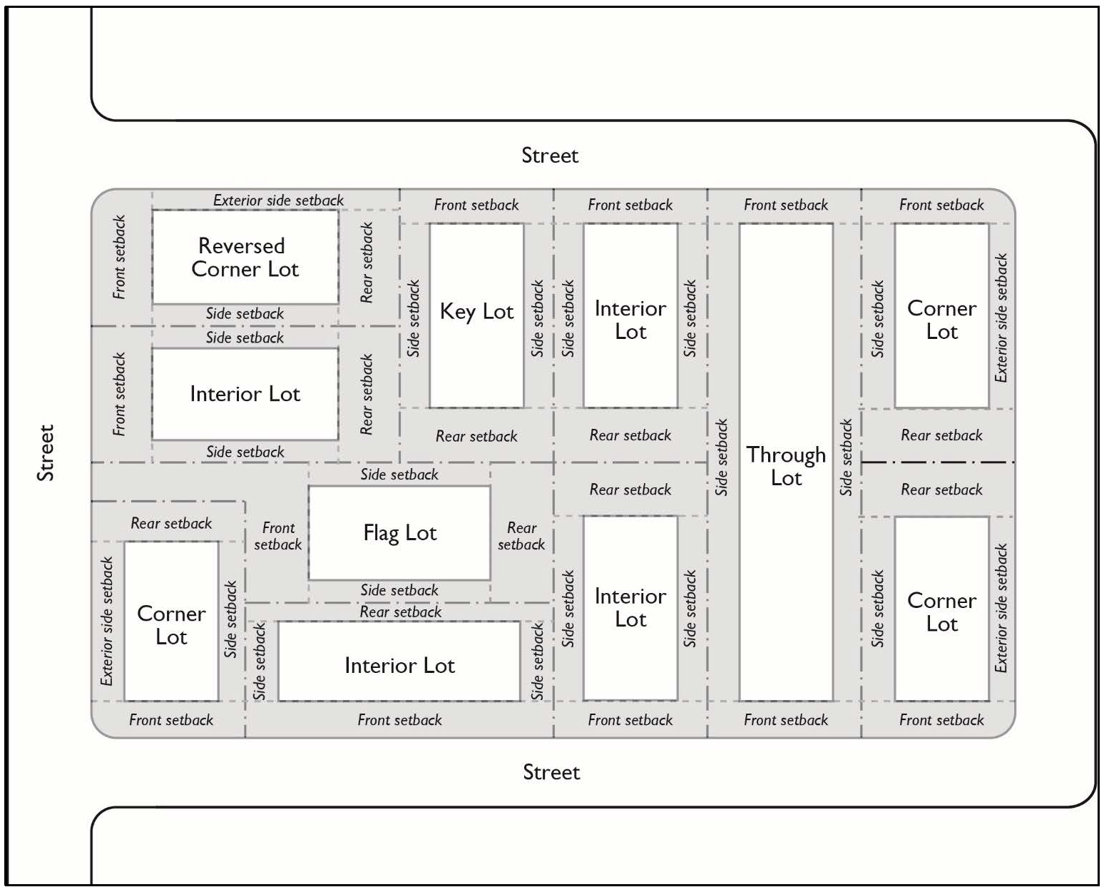 If the front property line is curved and/or composed of two (2) or more lines, use a straight line to measure the distance between the points where the front property line meets the side property line.
