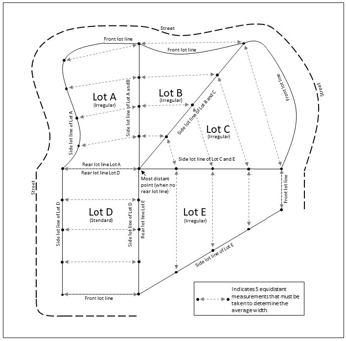 Calculate the average of a minimum of five (5) straight lines which best represent the average width of the building site area, the five (5) lines are determined using the process below: