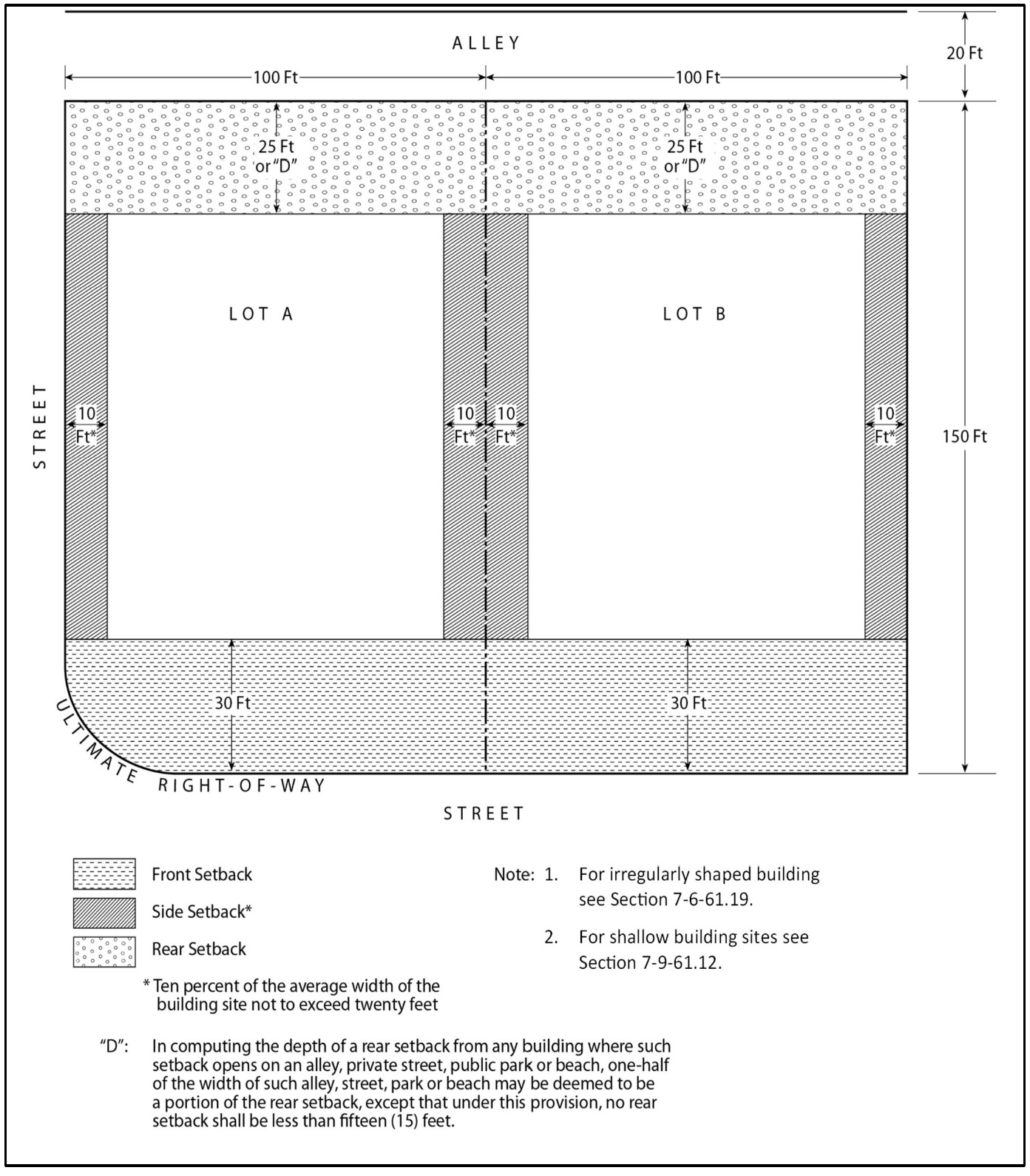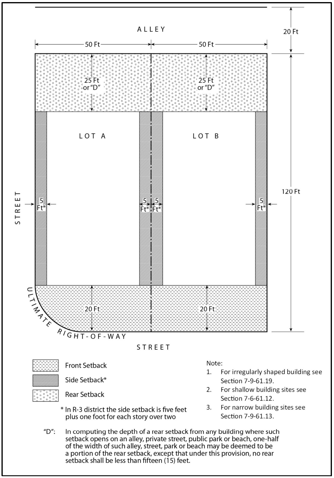Ultimate right-of-way. The right-of-way shown as ultimate on an adopted precise plan of highway alignment, or the street rights-of-way shown within the boundary of a recorded tract map, a recorded parcel map or a recorded PC development plan. The latest adopted or recorded document in the above cases shall take precedence. If none of these exist, the ultimate right-of-way shall be considered the right-of-way required by the highway classification as shown on the Master Plan Arterial Highways. In all other instances, the ultimate right-of-way shall be considered to be the existing right-of-way, in the case of a private street, and the existing right-of-way, but not less than sixty (60) feet, in the case of the public street.
