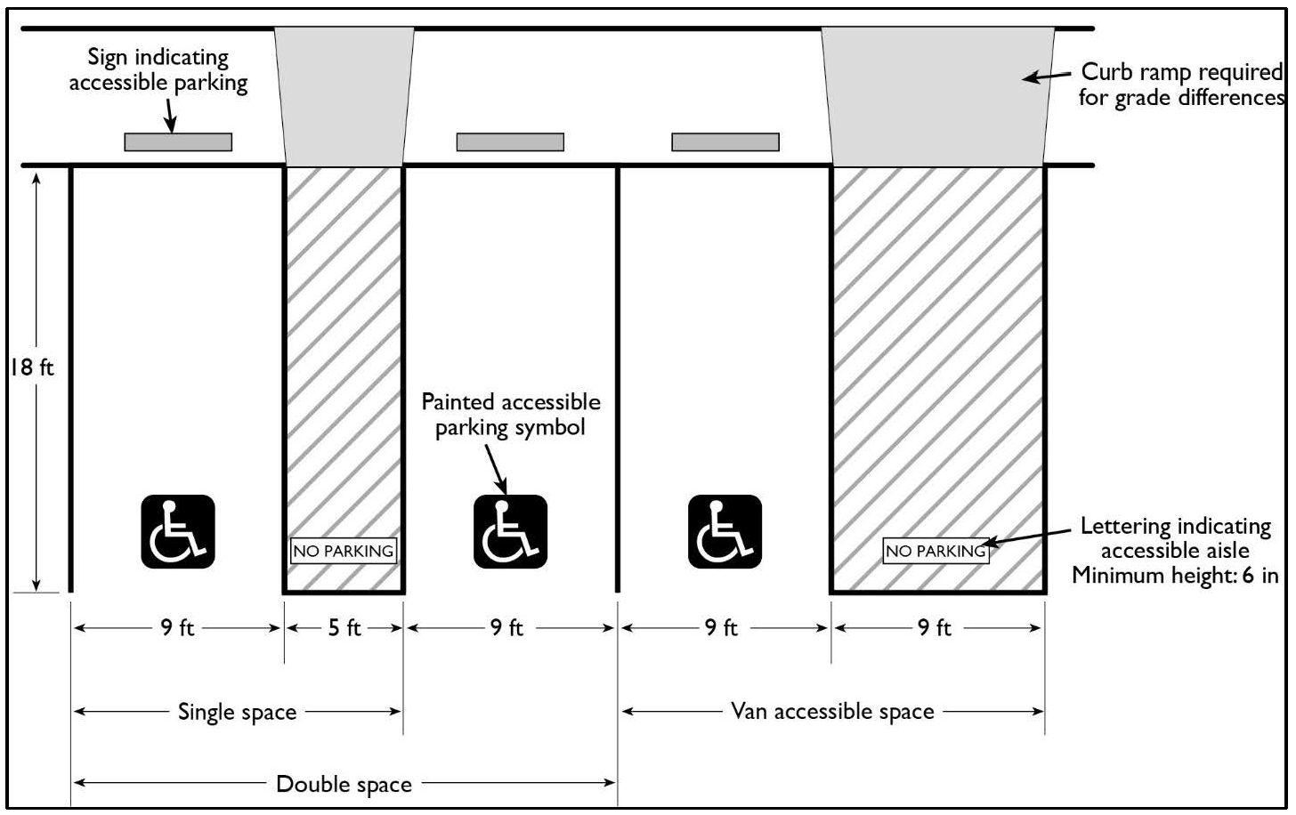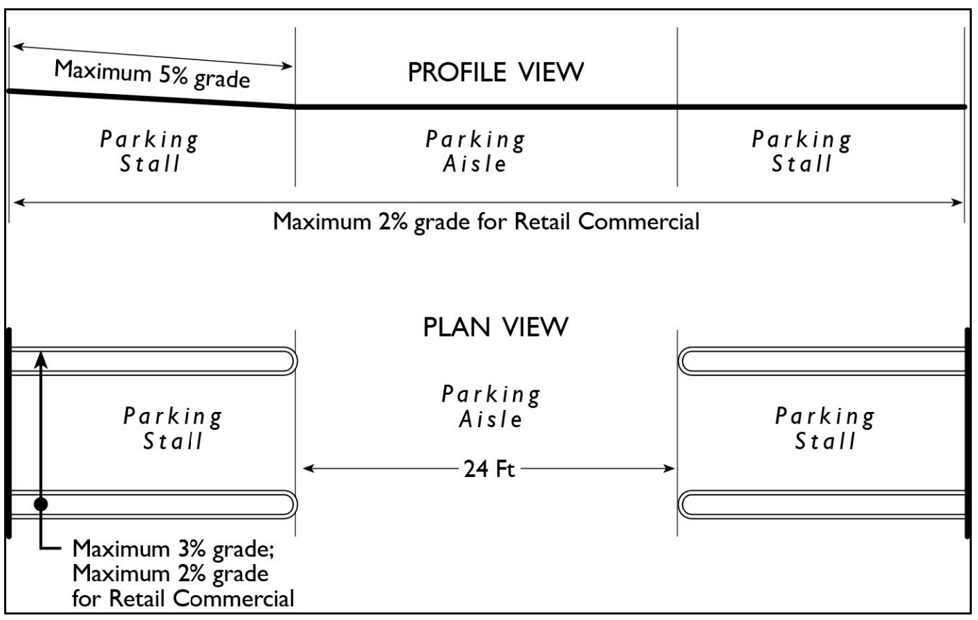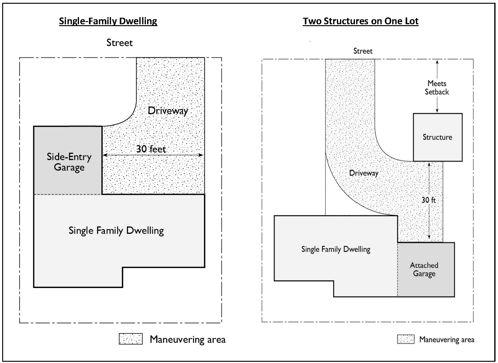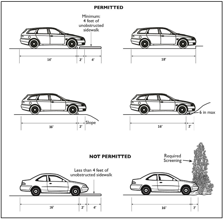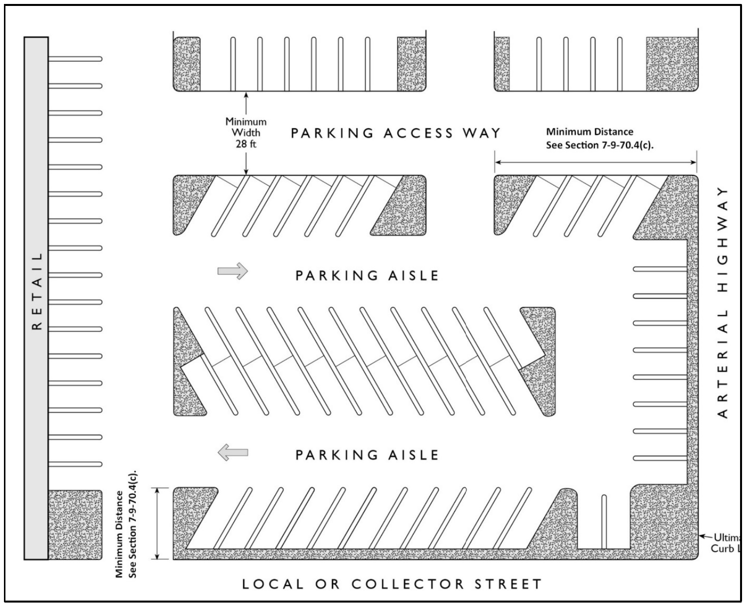 Tandem parking. An arrangement of parking spaces such that one (1) or more spaces shall be driven across to access another space or spaces.