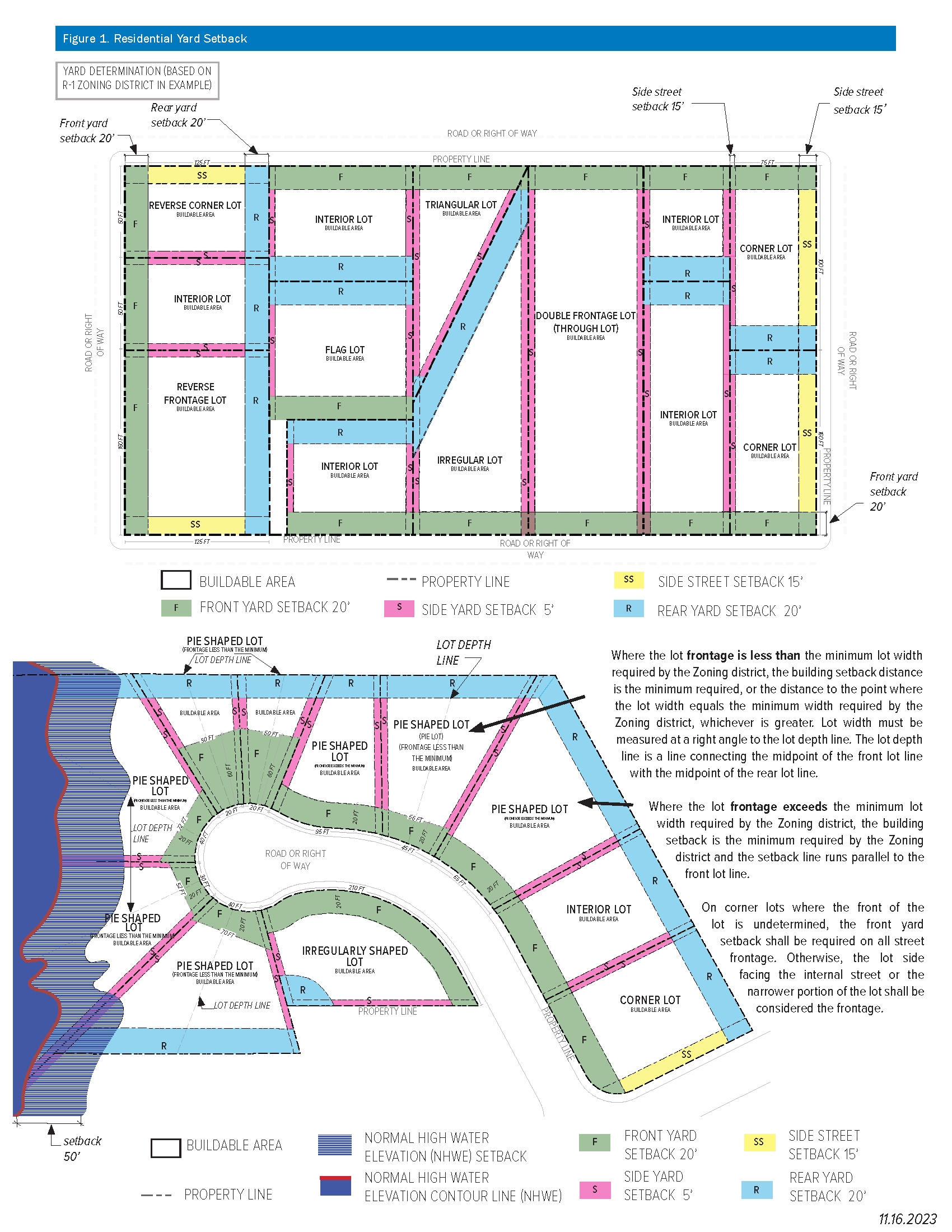 On double frontage lots, unless otherwise determined by the Zoning Manager the required front yard shall be provided on each street; except that when all lots in the block have been or will be developed with all of the buildings facing the same street, the second frontage of those lots shall be designated and utilized as rear yard. (See Figure 1 below.)