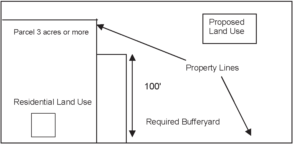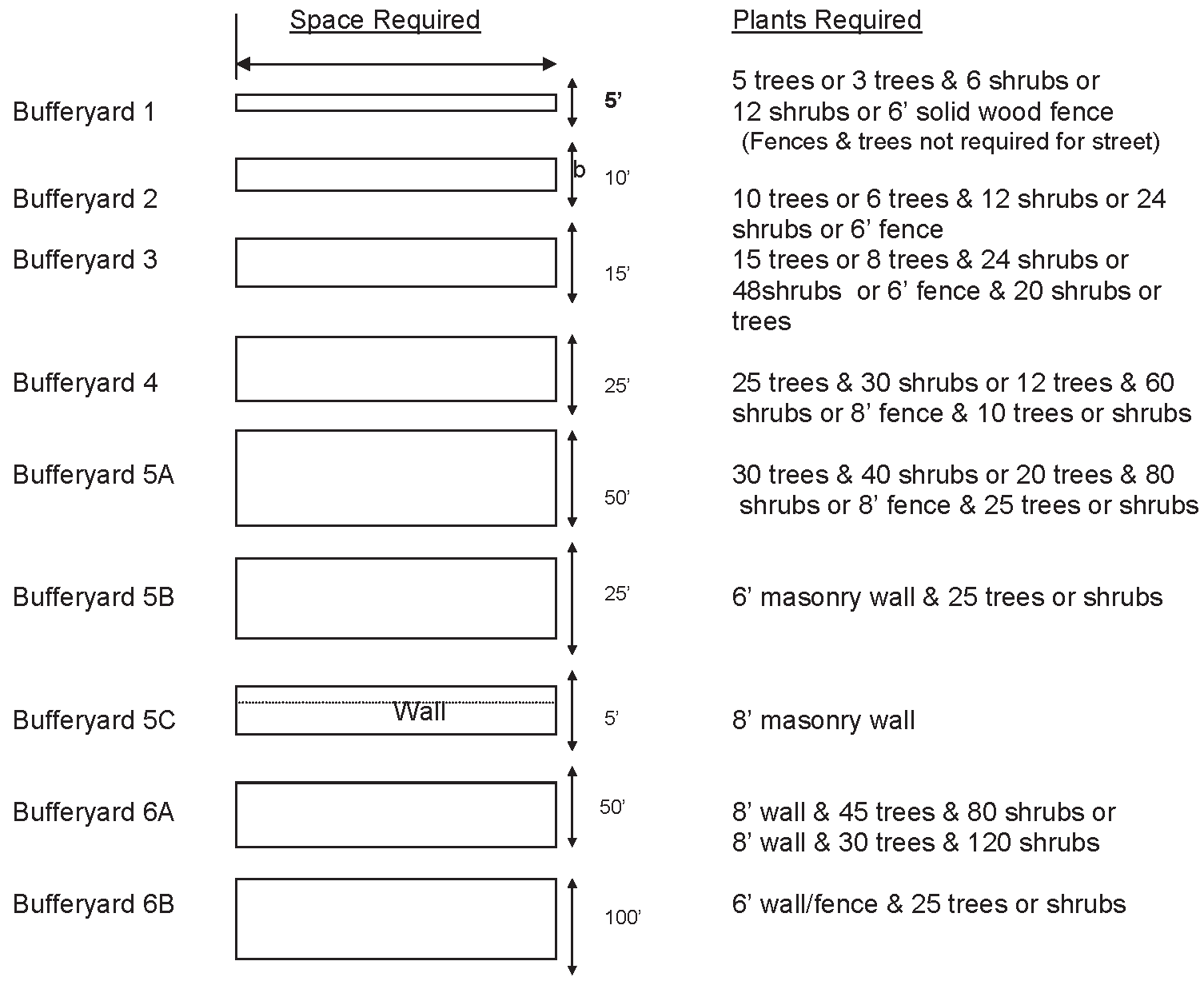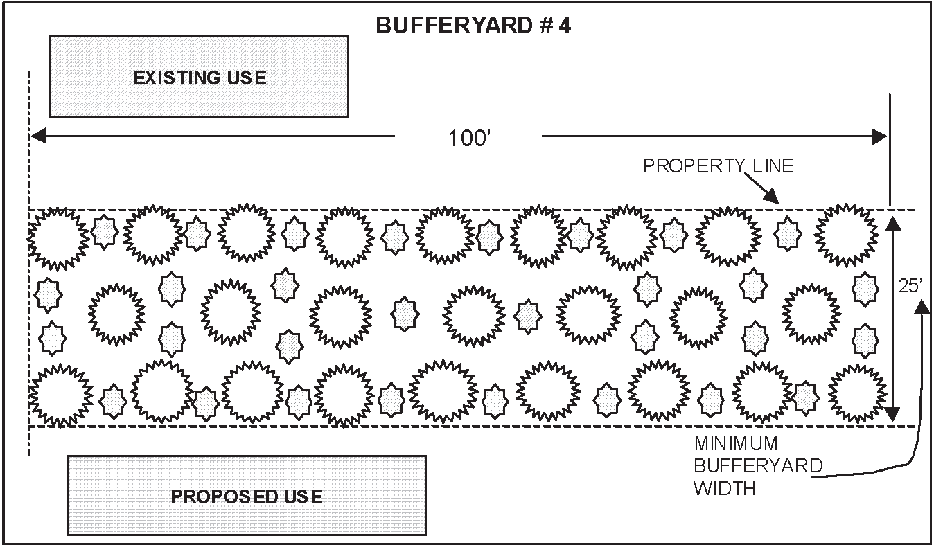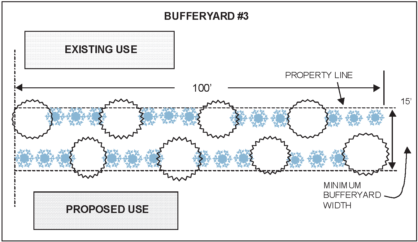 From Table 3, match the abutting use with the proposed new or expanded use to determine the type of bufferyard required. Should a question arise as to the land use classification of a proposed or abutting use the Zoning Administrator shall determine the classification. Next, refer to the Bufferyard Illustrations to determine the amount of bufferyard required. Several options of landscaping are available under each bufferyard. The requirements are given in 100-foot units as measured along the property line. Whenever a wall or fence is required, the location of the structure may be on either side of the required bufferyard.