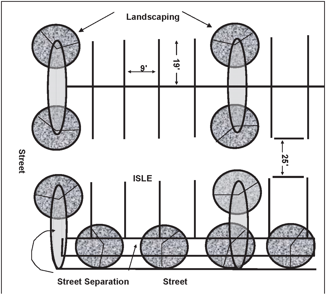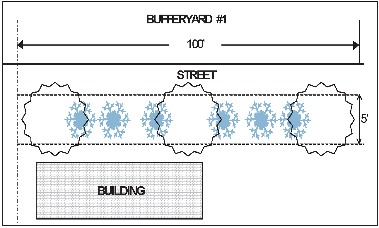 Bufferyards may not obscure a clear line of sight for vehicular traffic. Therefore, bufferyards should be placed no closer than 20 feet from street/road right-of-way lines.