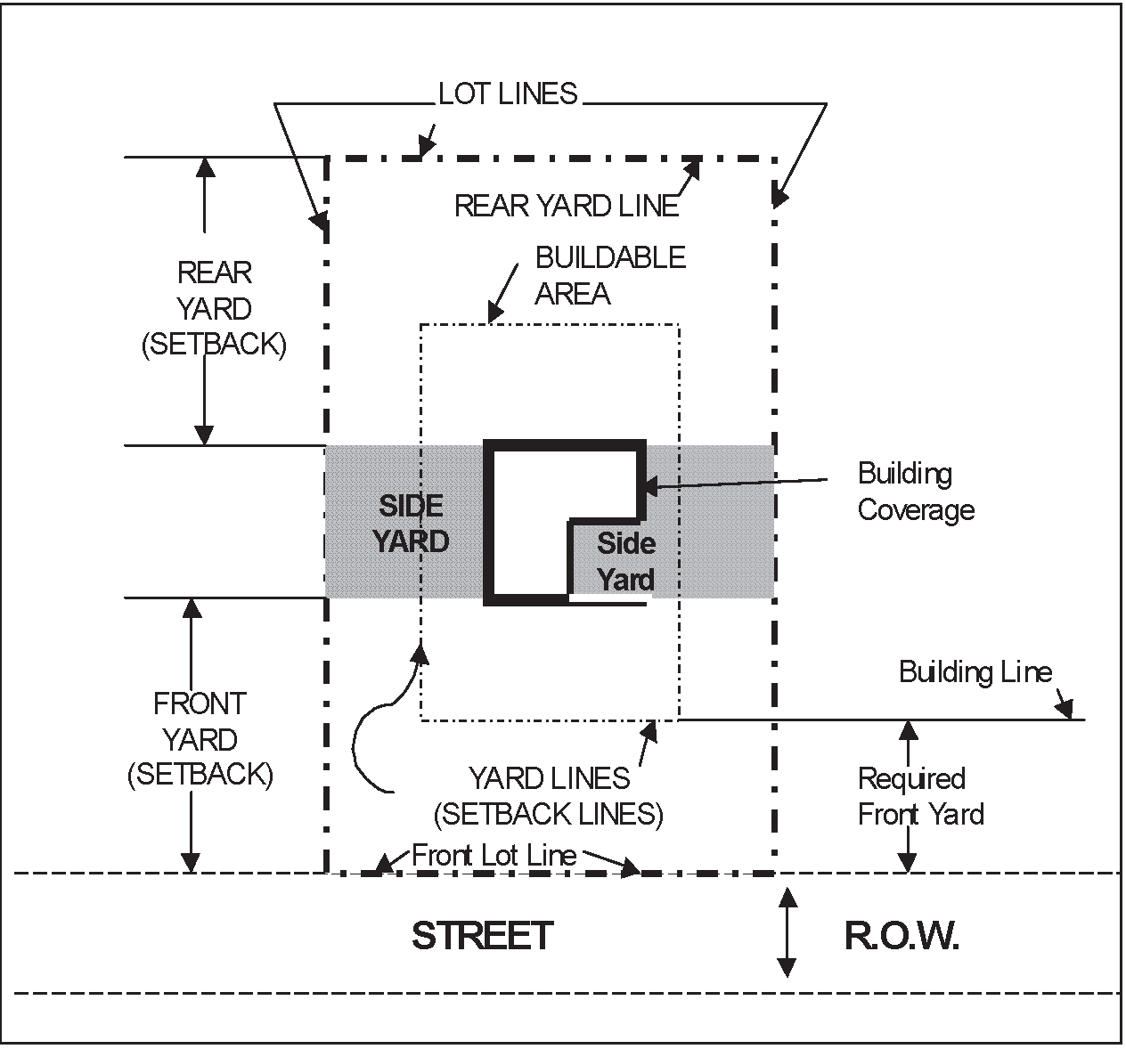 Yards, Setbacks, Buildable Area. The required front, side, and rear yards for individual lots, as set forth for by Table 2, shall be measured inward toward the center of said lot from all points along the respective front, side, and rear property lines of the lot. Once the yard areas of a given lot have been established, the remaining area of the lot which is not included in any required front, side, or rear lot shall be known as the "buildable" area within which the approved structure(s) shall be placed.