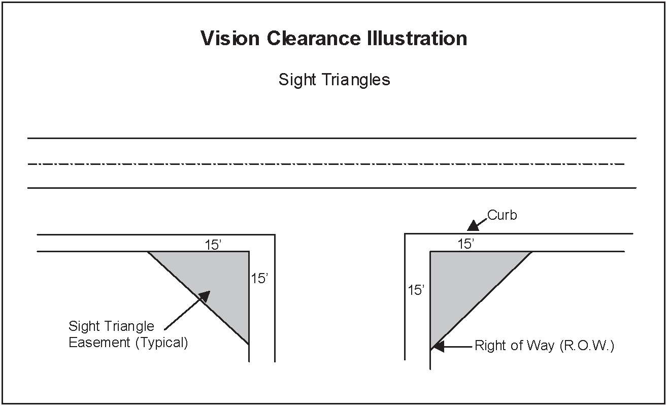 On any corner lot in any district, no planting shall be placed or maintained and no fence, building, wall, or other structure shall be constructed at any point between a height of 2½ feet and ten feet above the upper face of the nearest curb (or street centerline if no curb exists) and within the triangular area bounded on two sides by the street right-of-way lines and on the third side by a straight line connecting points on the two street right-of-way lines as required by the site triangular and vertical vision clearance illustration. However, poles and support structures less than 12 inches in diameter may be permitted in such areas.
