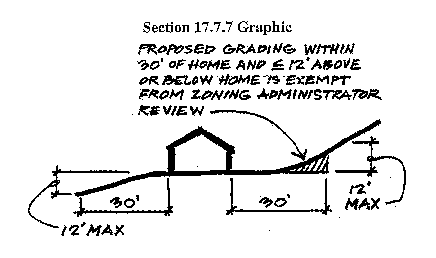 Any developed parcel of land with an average slope of more than fifteen (15) percent or a significant ridgeline and hilltop regardless of the slope, or both, shall not be graded without the specific authorization of the Zoning Administrator (or the Planning Commission when it has jurisdiction). This restriction shall not, however, apply to grading that is located as follows: (1) outside the required yard setbacks, (2) no more than thirty (30) feet from the footprint of the primary residence, and (3) no more than twelve (12) feet above or below the elevation of the existing grade at the closest portion of the residence (see Section 17.7.7 graphic). Approval by the Zoning Administrator (or the Planning Commission when it has jurisdiction) shall be granted only upon a showing that the proposed grading will comply with the objectives and regulations of this chapter, including the standards set forth in this section, and will not have a substantial visual impact when viewed from surrounding community areas.