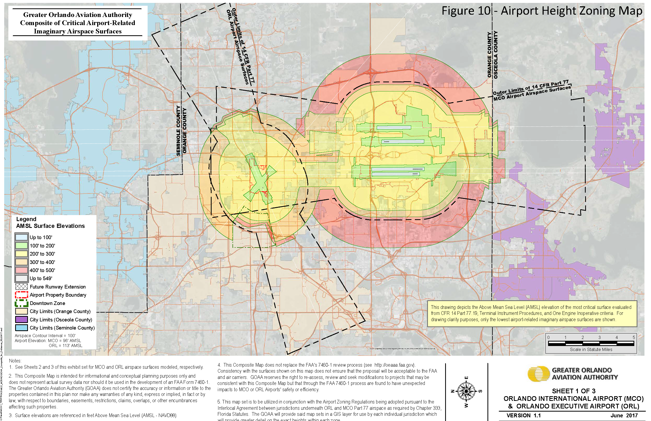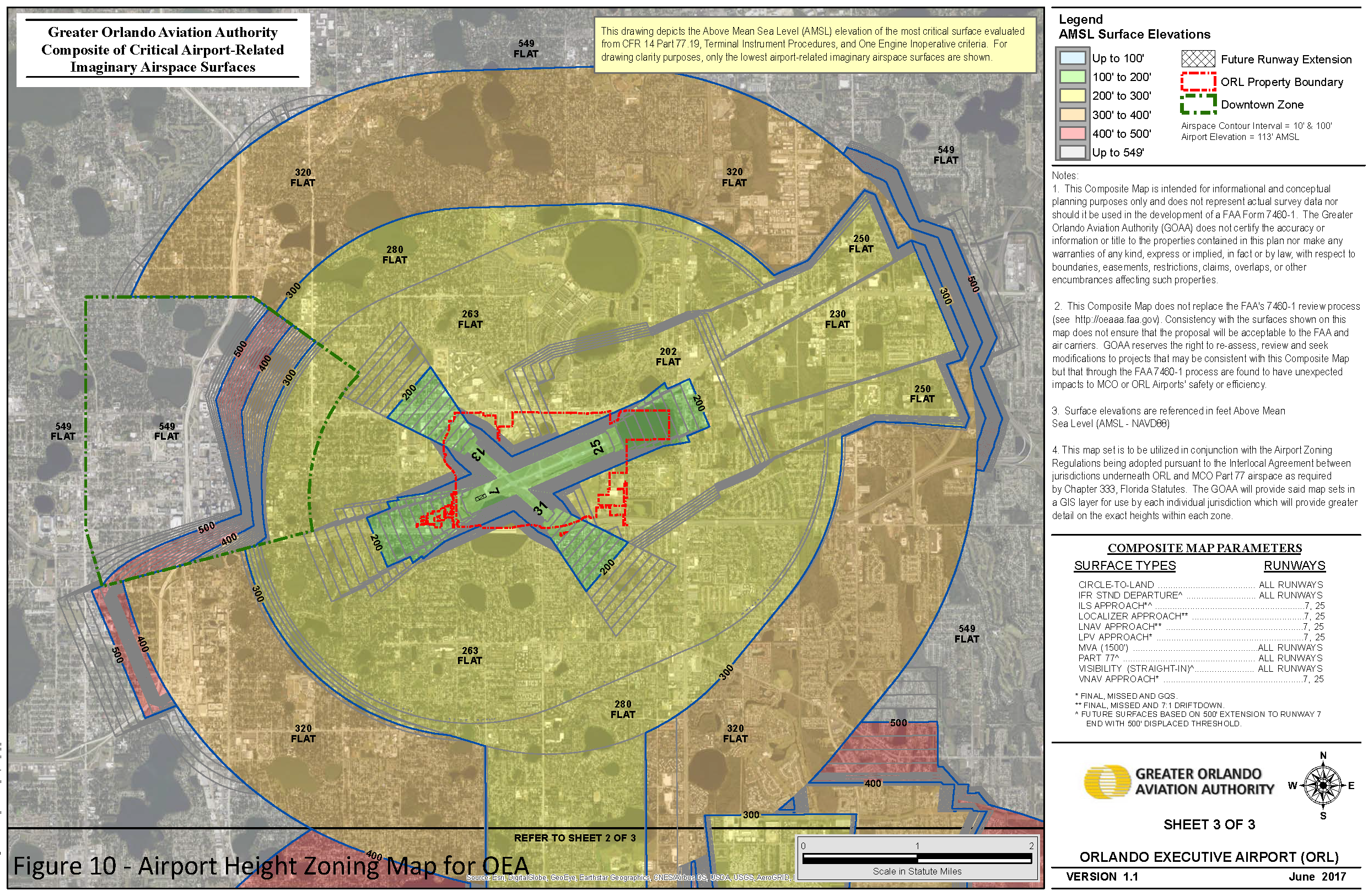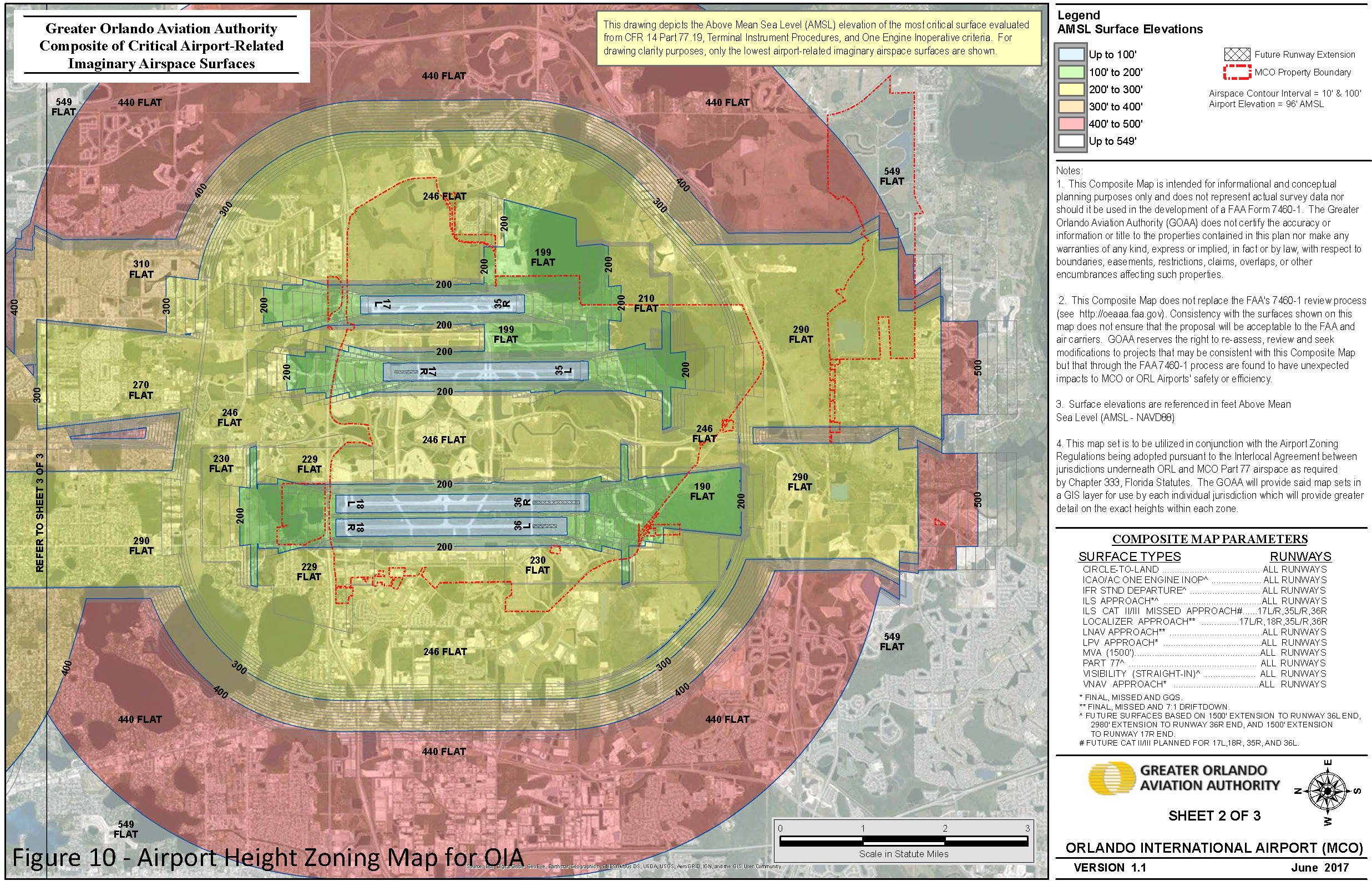 There are hereby created and established certain airspace imaginary surfaces in order to evaluate whether any existing or proposed structure or object of natural growth complies with federal obstruction standards as contained in 14 CFR §§ 77.13, 77.15, 77.17, 77.19, 77.21, and 77.23 terminal instrument procedures as contained in FAA Order 8260.3C and Order 8260.58A, entitled United States Standards for Terminal Instrument Procedures and federal regulations for turbine powered aircraft as contained in 14 CFR § 121.189. The airspace surfaces are hereby specified for the most restrictive approach existing or planned for each runway and any planned extension of existing runways and include all of the land lying beneath the airspace surface, as applied to each airport. Except as otherwise provided in these Regulations, no application for an airport height zoning permit may be approved; no structure may be developed, constructed, established, enlarged, substantially altered or repaired, approved for construction, or issued a natural resources permit or building permit; and no object of natural growth may be planted, allowed to grow or be replanted, in any airspace surface at a height above the height limit established herein for the airspace surface in which the structure or object of natural growth is located or proposed to be located. Such height limits will be computed from mean sea level elevation, unless otherwise specified. The 14 CFR part 77C (primary, horizontal, conical approach and transitional) airspace surfaces have been analyzed by GOAA, and are illustrated in Figure 10, and are further defined as illustrated in FAA Order 7400.2k, entitled Procedures for Handling Airspace Matters.