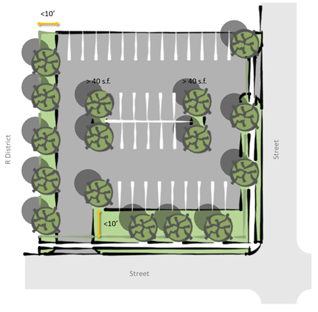 Each unenclosed parking facility shall provide a minimum landscaped buffer width of ten feet along any street property line with at least one medium or large tree or evergreen every forty linear feet of the property line along the buffer.