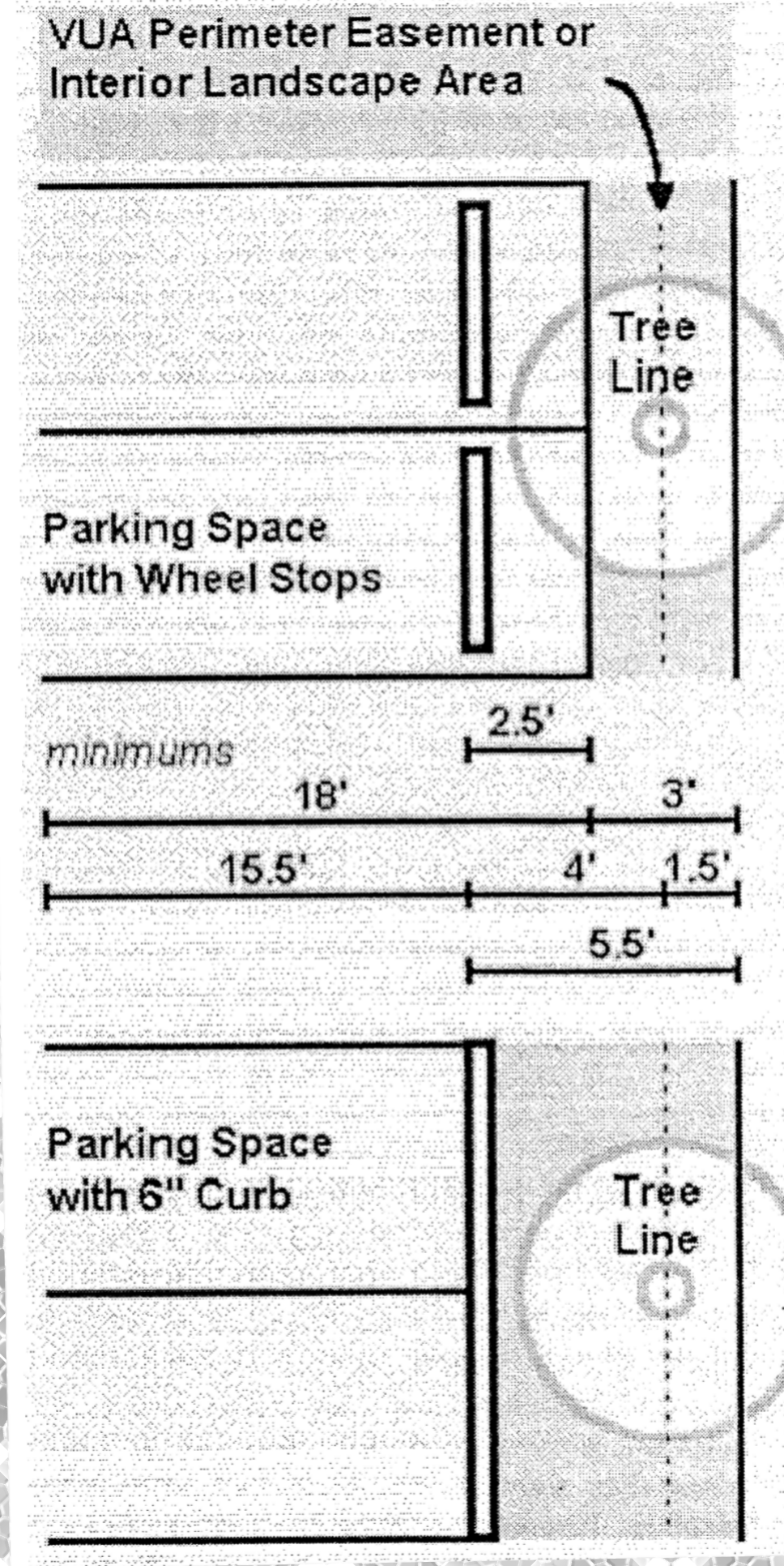 17.33 Dimensional Standards Where Vehicles Overhang Landscape Areas. The dimensional standards depicted in the following illustration shall be utilized for VUA Perimeter Landscape Easements and VUA Interior Landscape Areas where vehicles overhang.