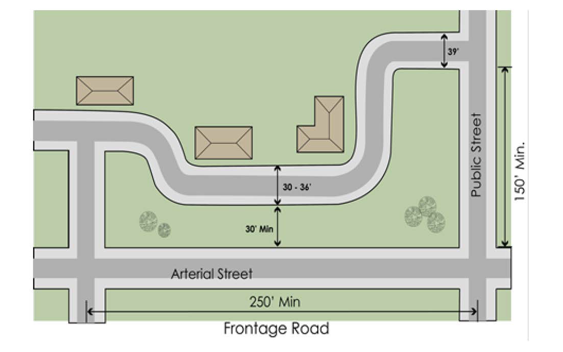 Frontage road access to public streets shall be spaced according to the standards of section 38-205 Above, driveway spacing from intersections and section 38-206 Above, driveway spacing from other driveways.