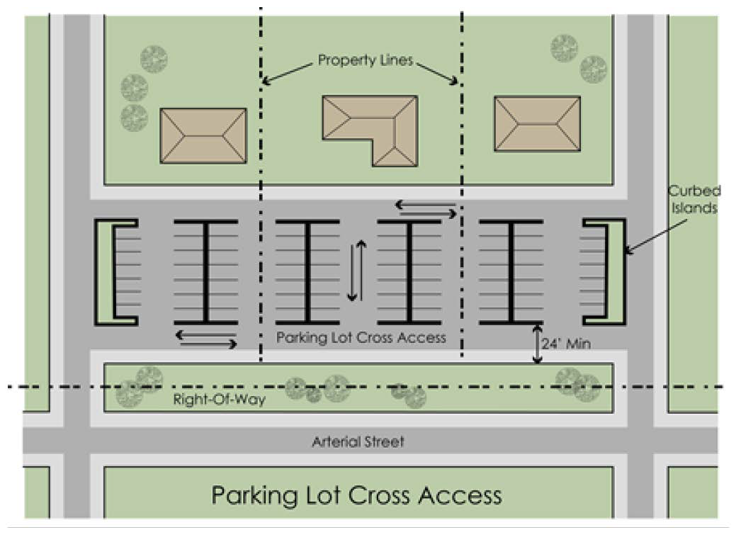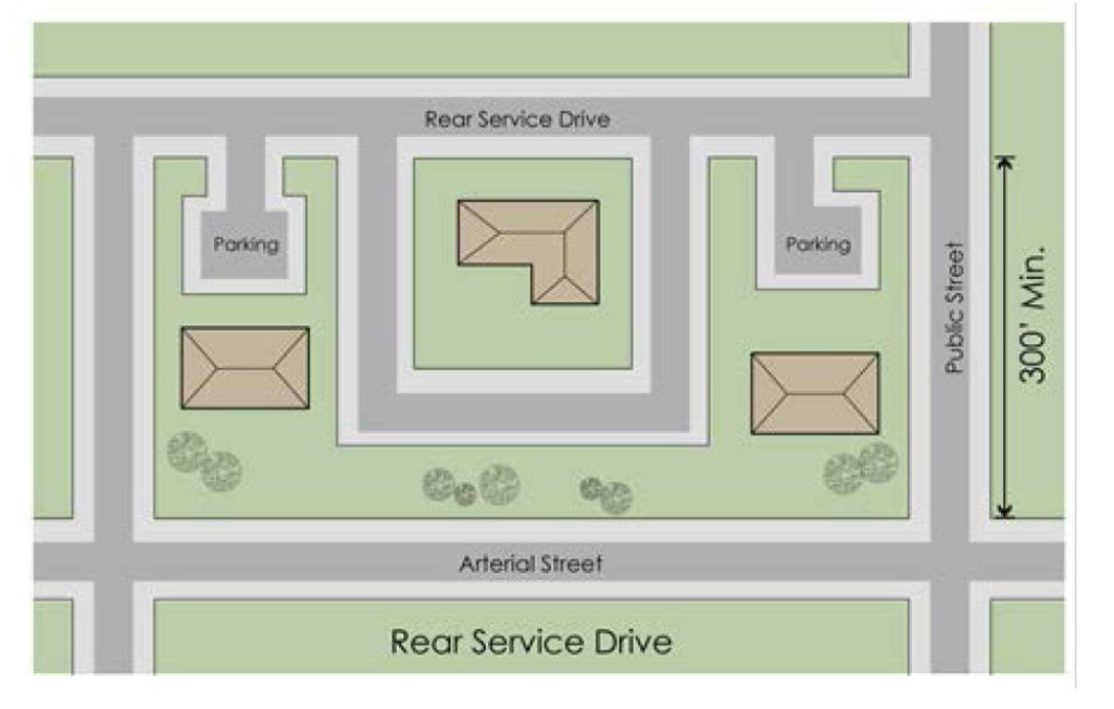 Shared use of access between two (2) or more property owners should be encouraged through use of driveways constructed along property lines, connecting parking lots and construction on- site of frontage roads and rear service drives; particularly within one-quarter mile of major intersections, for sites having frontage on two (2) or more streets, where frontage dimensions are less than three hundred (300) feet, at locations with sight distance problems, and/or along roadway segments experiencing congestion or accidents. In such cases, shared access of some type may be the only access design allowed.