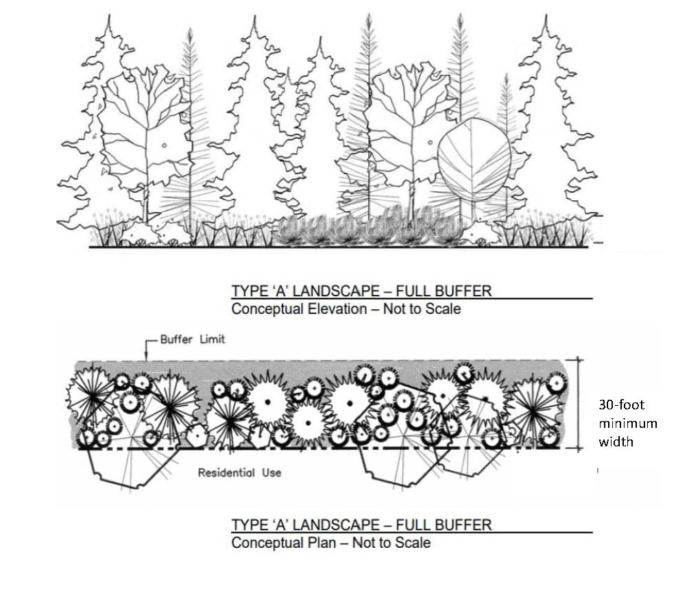 Buffer zone A: Thirty-foot minimum width, along the property line with two (2) canopy trees and four (4) shrubs, or one (1) canopy tree, one (1) evergreen and four shrubs per 20 linear feet, rounded upward, and including a wall, berm or combination of these elements as determined by the planning commission.
