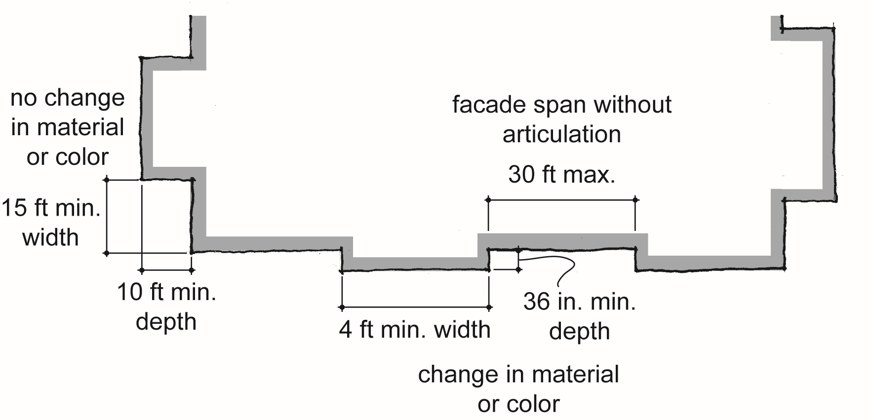 Vertical building articulation. Minimum depth and width of articulation is 36 inches and four ft, respectively, if corresponding with a change in color or building material and/or roofline. Otherwise, minimum depth and width of articulation is 10 ft and 15 ft, respectively. Projecting balconies, including those that are partially recessed, may count toward this requirement.