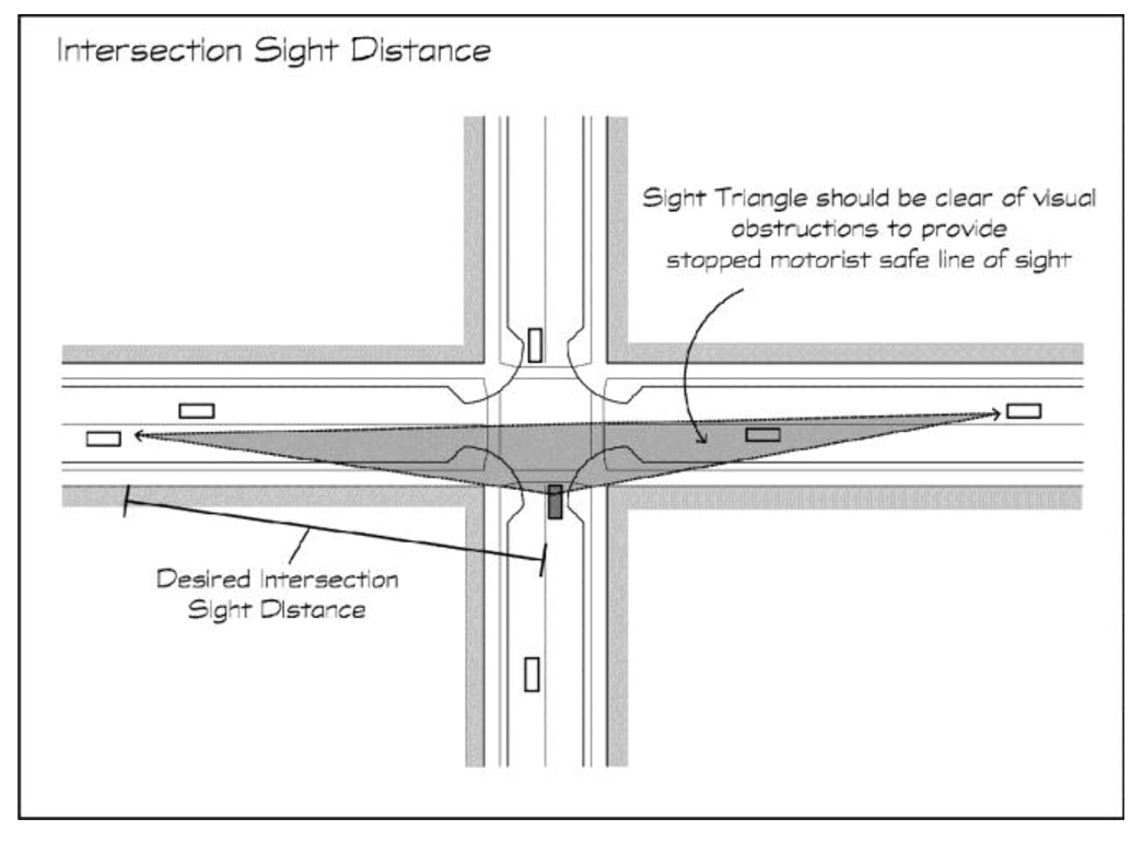 No fence, wall, sign, hedge or planting or similar improvement will be permitted to obstruct the sight lines or visibility of motorists or pedestrians at any intersection of public or private streets or at any driveway intersection with a public or private street. For purposes of this section, obstructions shall be defined in terms of height as elevations between 30 inches and 12 feet above any roadway or driveway, as applicable.