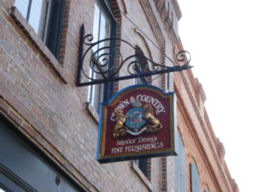 Projecting signs. Projecting signs are attached to a building face and project out perpendicular to the building wall. Projecting signs are very effective when oriented to pedestrians on the sidewalk level. Appropriate materials include wood and metal with carved or applied lettering, or any other material that is architecturally compatible with the building that the sign is attached to. Multiple projecting signs should not be installed within ten feet of each other if on the same property and should be separated from projecting signs on adjacent properties by ten feet to ensure proper visibility.