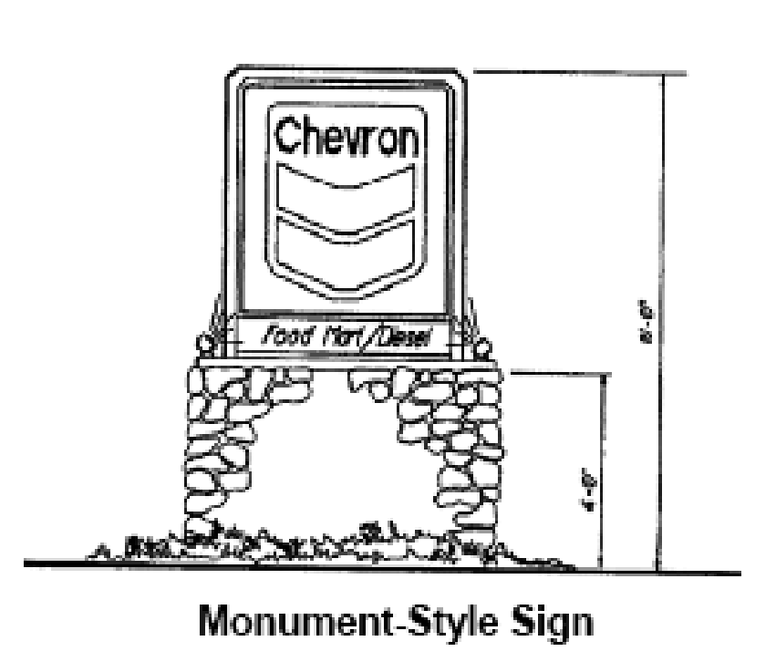 Monument signs. Monument signs are typically used where building setbacks, orientation or design make it difficult to provide other types of signage, such as wall signs, that are plainly visible to people that are trying to identify a use. Monument signs have a solid base that the sign face is installed upon. These signs should be designed so that the style of the sign and its base are consistent with the architecture of the buildings on the site. They are typically oriented perpendicular to the adjacent street and sidewalk and have a maximum of two parallel sign faces. Monument signs provide opportunities for landscaping to enhance their appearance.