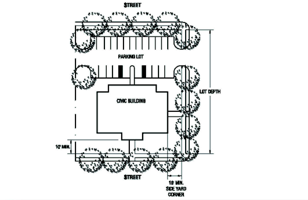 Plazas may not have trees or planted materials. However, trees may form the geometric frame of the plaza space or for the structure the plaza services. Spacing shall be a minimum of ten feet on center and 30 feet on center maximum.